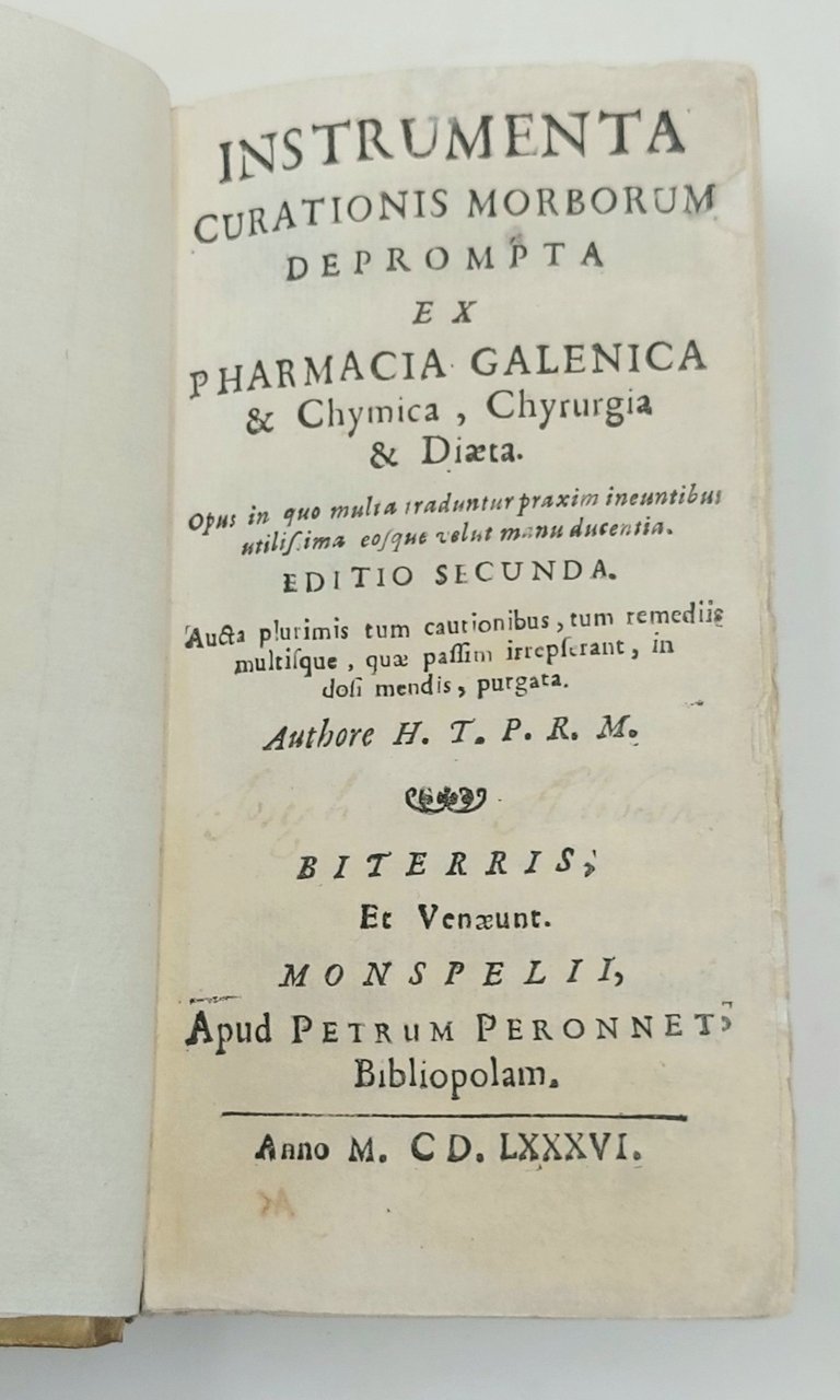 >in-12 (145x80 mm), pp. 560; legatura coeva piena pergamena, titolo ms al dorso. Seconda edizione (la prima è del 1679) di questo celebre trattato di medicina redatto da Jérôme Tenque: H(ieronymo) T(enque) P(rofessore) R(egio) M(onspeliensis). Medico e Professore della facoltà di medicina di Montpellier. Copioso è l'Index de Instrumentis Pharmaceuticis Galenicis & Chimicis. Buon esemplare (gli ultimi fogli d'indice corti di margine, una macchia nel margine bianco dei primi 20 ff ca).