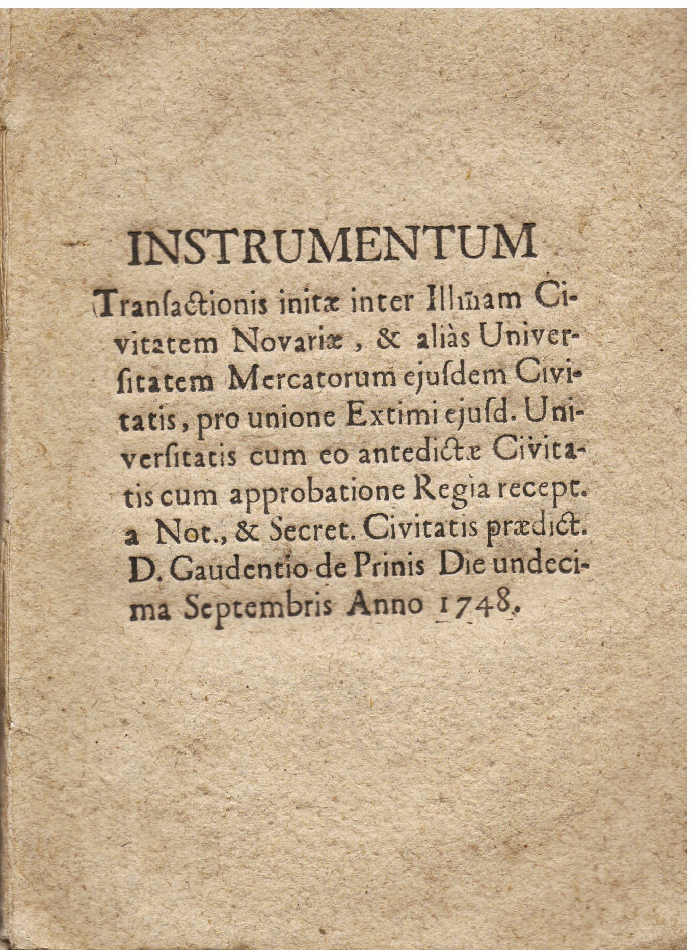 INSTRUMENTUM Transactionis Initae Inter Ill.mam CIVITATEM NOVARIAE, & alias Universitatem Mercatorum ejusdem Civitatis, pro unione extimi ejus. Universitatis cum eo antedictae Civitatis cum approbatione Regia recepta a Not., & secret. civitatis praedict. D. Gaudentio De Prinis die undecima septembris anno 1748