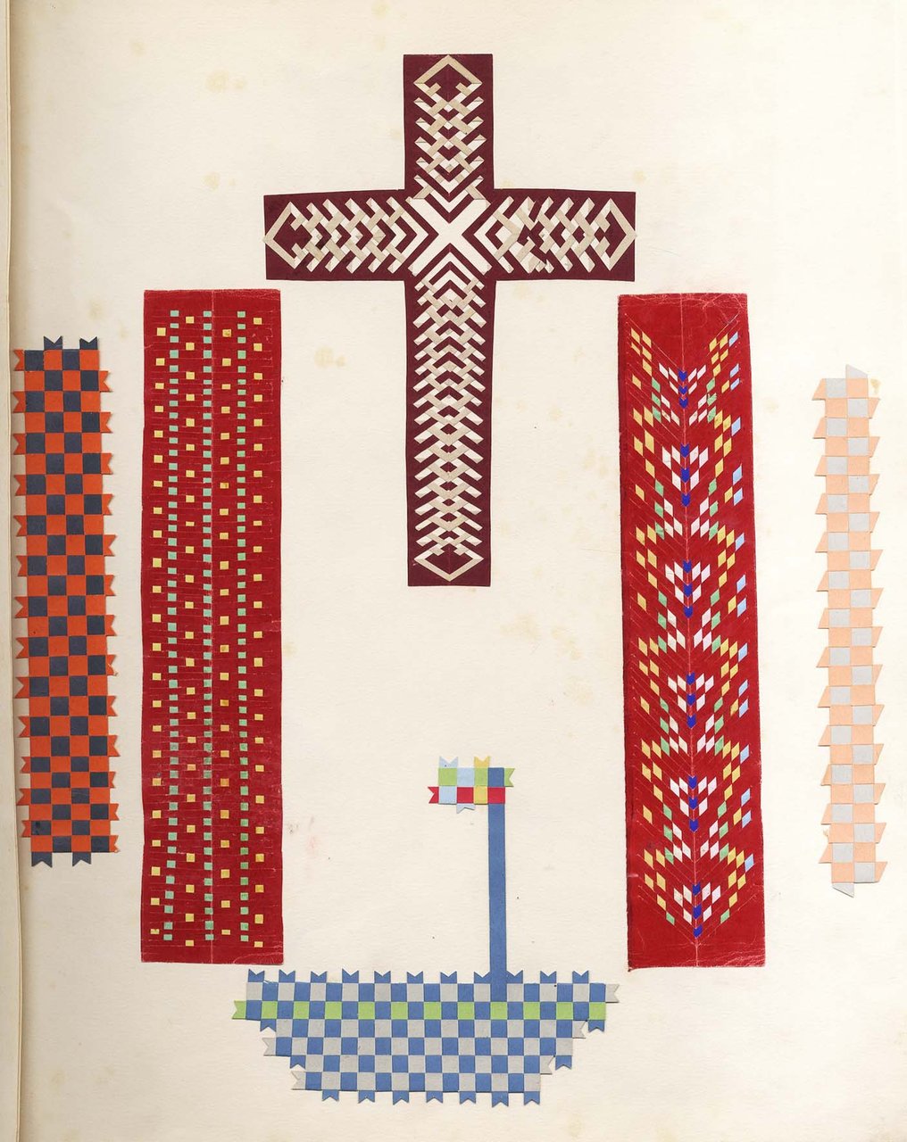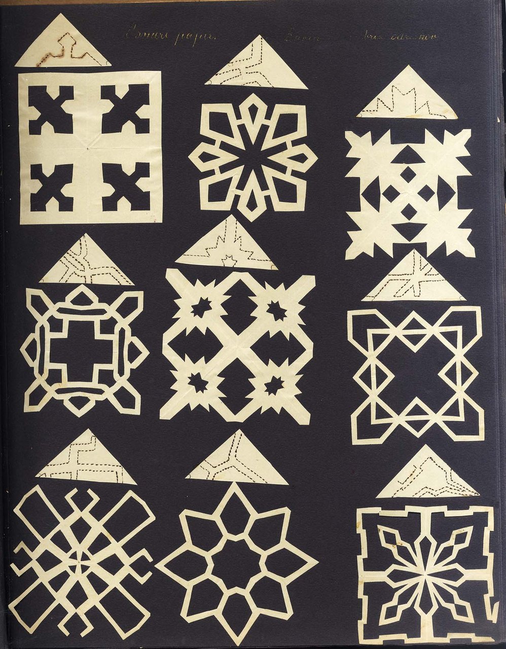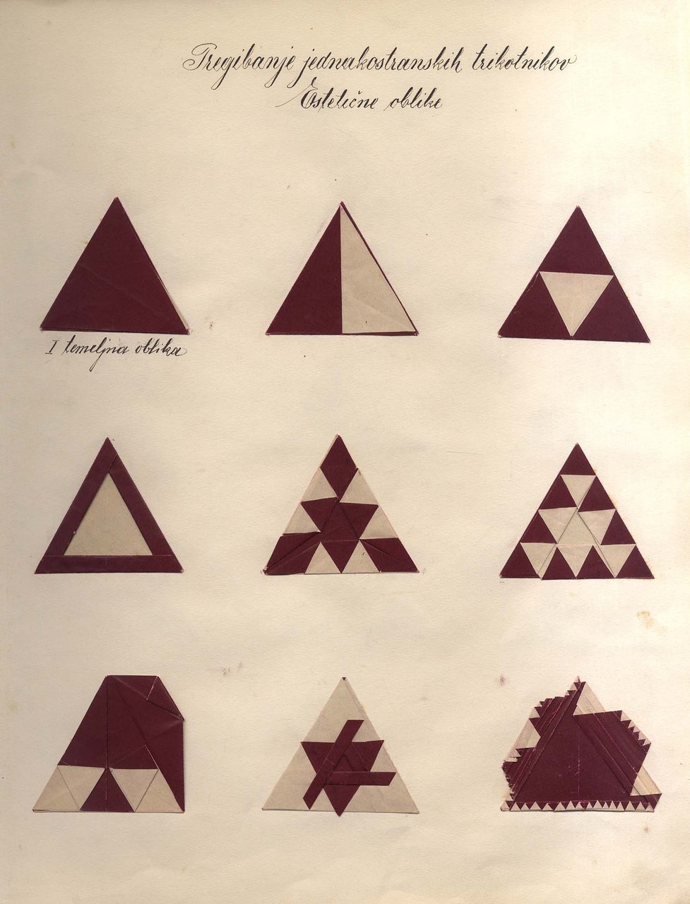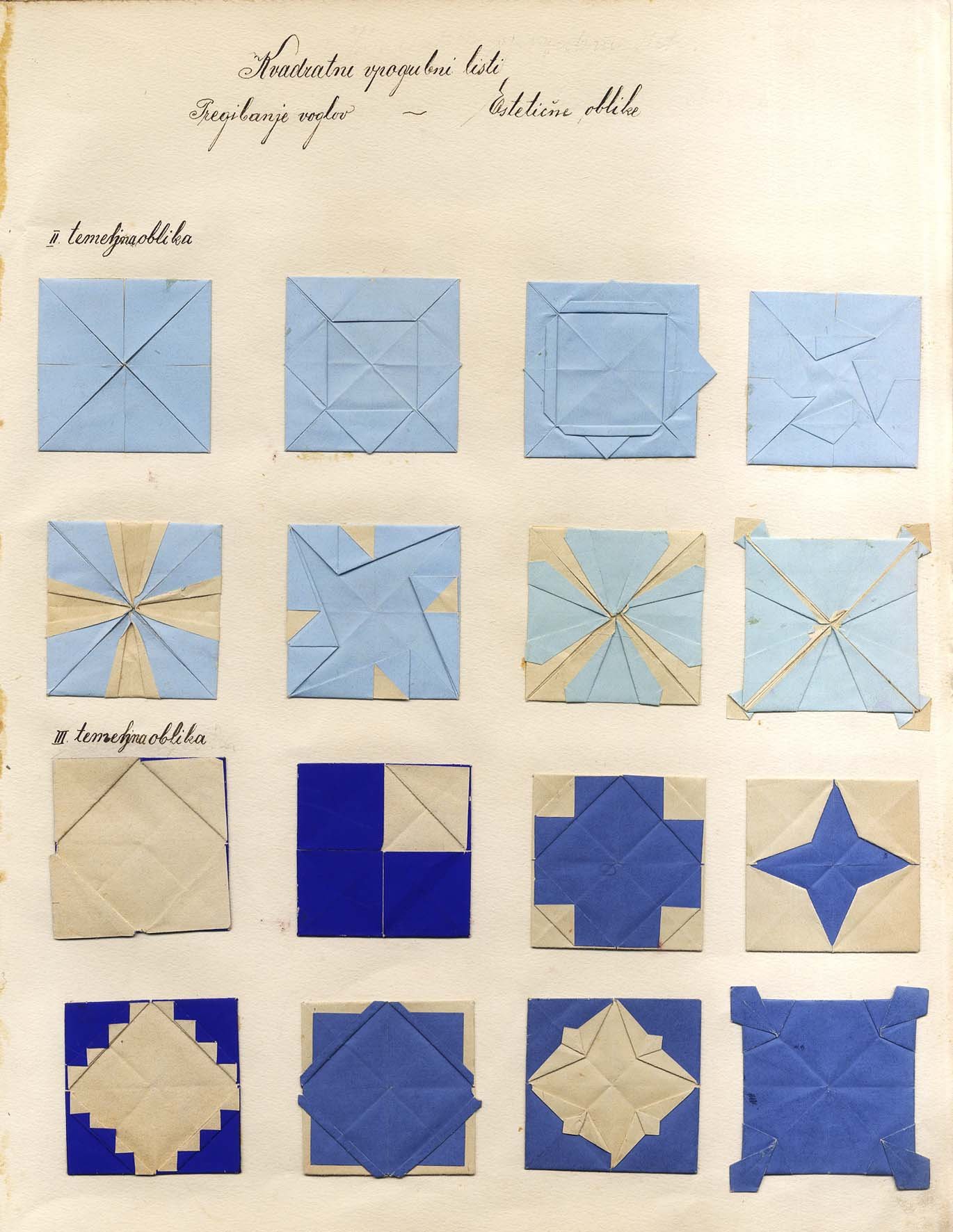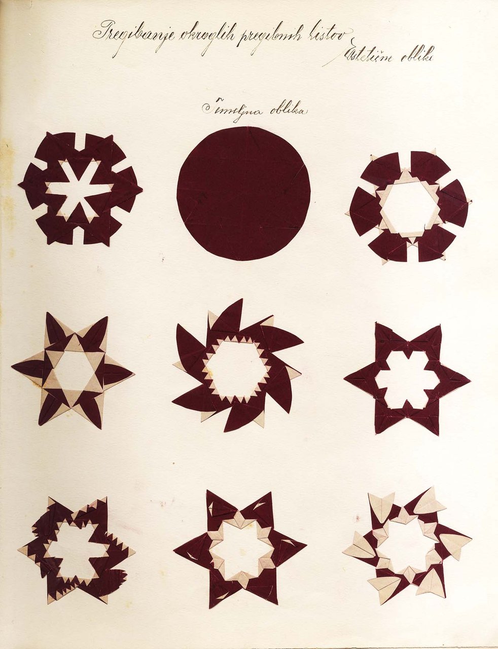 >Album in folio (360x280 mm), legatura m. tela e angoli. La raccolta si compone di 25 fogli di cartoncino, ognuno con applicate 9, 12 o 16 composizioni di carta ripegata di vari colori: 13 tavole hanno origami di forme e colori diversi (Pregibna sola); 3 fogli con intrecci di carte di colori e pesi diversi (Prosto vpletanje); 6 fogli su fondo marrone con decoupages ed intagli della carta (Fzrezovanje); 3 fogli su fondo marrone con silhouettes. Curiosissima raccolta di lavori di provenienza slovena che illustrano l'abilità nell'uso e lavorazione manuale della carta. Estremamente inusuale e di facile deperibilità.