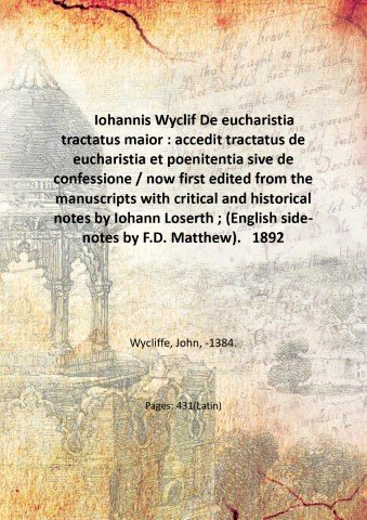 Iohannis Wyclif De eucharistia tractatus maior : accedit tractatus de eucharistia et poenitentia sive de confessione / now first edited from the manuscripts with critical and historical notes by Iohann Loserth ; (English side-notes by F.D. Matthew). 1892