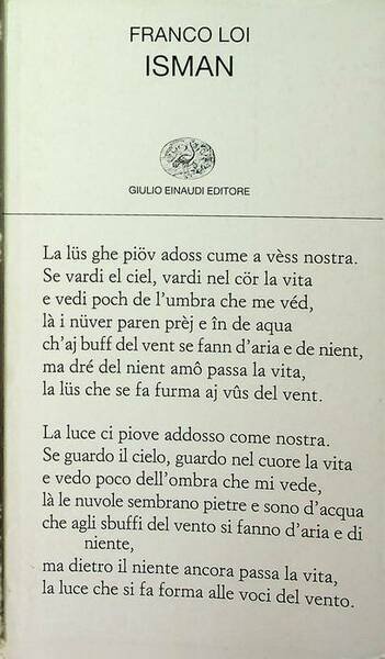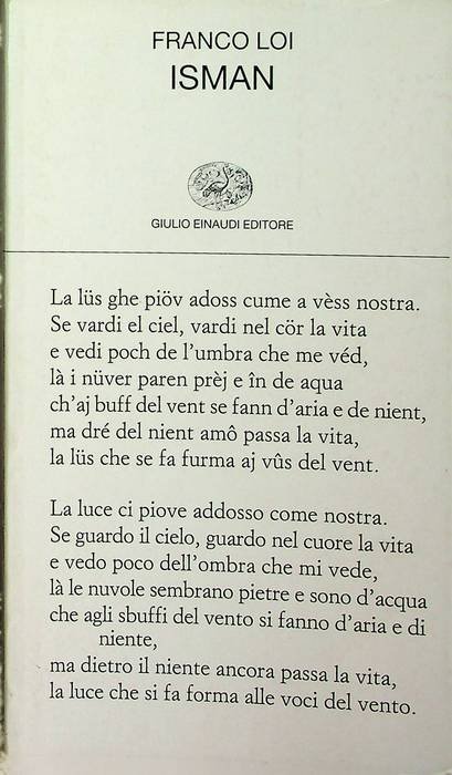 122 p., 19 cm, bross. Condizioni : USATO - Stato : Più che buono. Altre note : DI DIFFICILE REPERIBILITA'. La poesia di Franco Loi è un fare connaturato al respiro, allo stesso esserci. Emana, naturalmente e misteriosamente, dalla semplicità di un viversi in tutti i propri contrasti, dall’accettazione, mai passiva ma consapevole, di tutto il positivo e il negativo dentro e fuori di noi. Questi nuovi testi si calano nelle pieghe e nei movimenti di una umoralità densa e terrena, che trova forma negli scorci cittadini, nel variare stagionale di cieli, aria, colori e paesaggi, nel dialogo fra passato e presente, nelle figure che prendono rilievo sulla pagina. Isman è una di loro – come Steven, Madalèna, Erminia, o i carcerati che sono «una domanda che mai avrà risposta». Voce singola e riconoscibile, ma portatrice di una coralità dispersa, sbriciolata, spesso emarginata, quella del poeta si modula attraverso una scala di tonalità : dall’invettiva, sempre bilanciata da un sapido humour, ad aperture liriche e confidenziali. In un percorso che comprende considerazioni sulla scrittura e l’essere poeta, sul mutare della percezione di se attraverso il tempo, sull’intuita presenza di Dio, silenzioso interlocutore.
