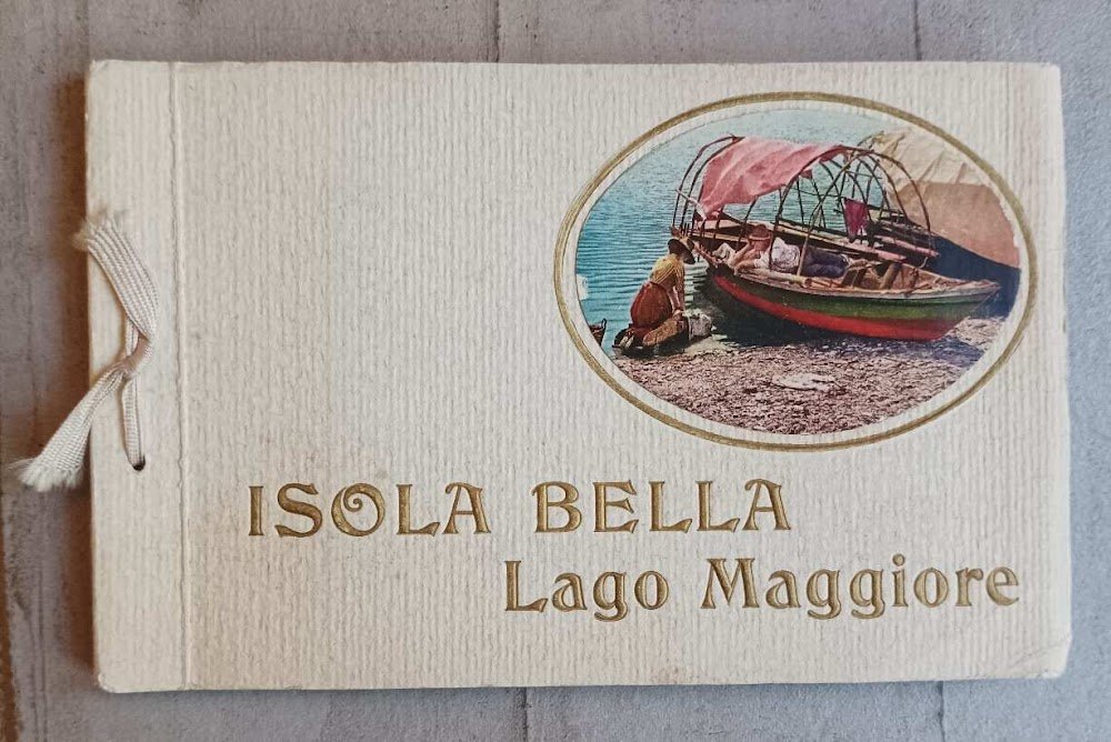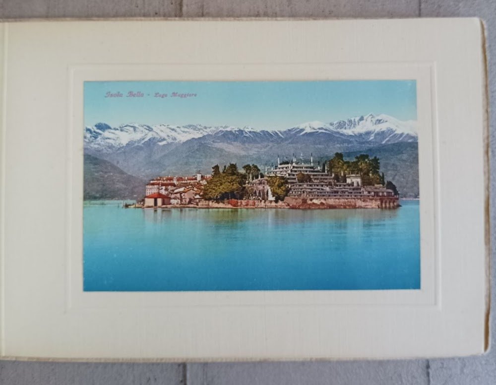 >In -8 oblungo (mm 145 x 225), ff. 12 con applicate cartoline (mm 87 x 138) a colori dell'Isola Bella e dei suoi dintorni, entro cornice a secco. Leg. edit. in cartoncino, titolo in oro al piatto ant. con ovale figurato a colori applicato entro bordura a secco dorata. Raccolta di magnifici paesaggi dell'Isola Bella e dei suoi dintorni; paesaggi fotografici risalenti agli anni '50, non comune. Esemplare in perfette condizioni.