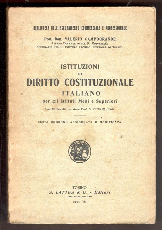 Istituzioni di Diritto Costituzionale italiano per gli istituti Medi e Superiori. Con lettera del Senatore Prof. Vittorio Cian