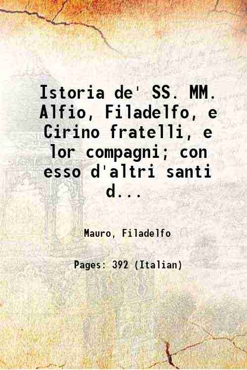 Istoria de' SS. MM. Alfio, Filadelfo, e Cirino fratelli, e lor compagni; con esso d'altri santi della citta di Lentini / composta dal P. Filadelfo Mauro . Cavata dall'originale greco di Grotta Ferrata, e da altri autori riceuuti: e dall'idioma latino tradotta nell'italiano 1691