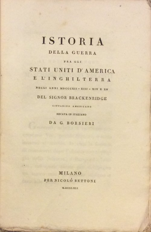 ISTORIA DELLA GUERRA FRA GLI STATI UNITI D'AMERICA E L'INGHILTERRA. - Negli anni 1812 - 13 - 14 e 15. Recata in Italiano da G. Borsieri.
