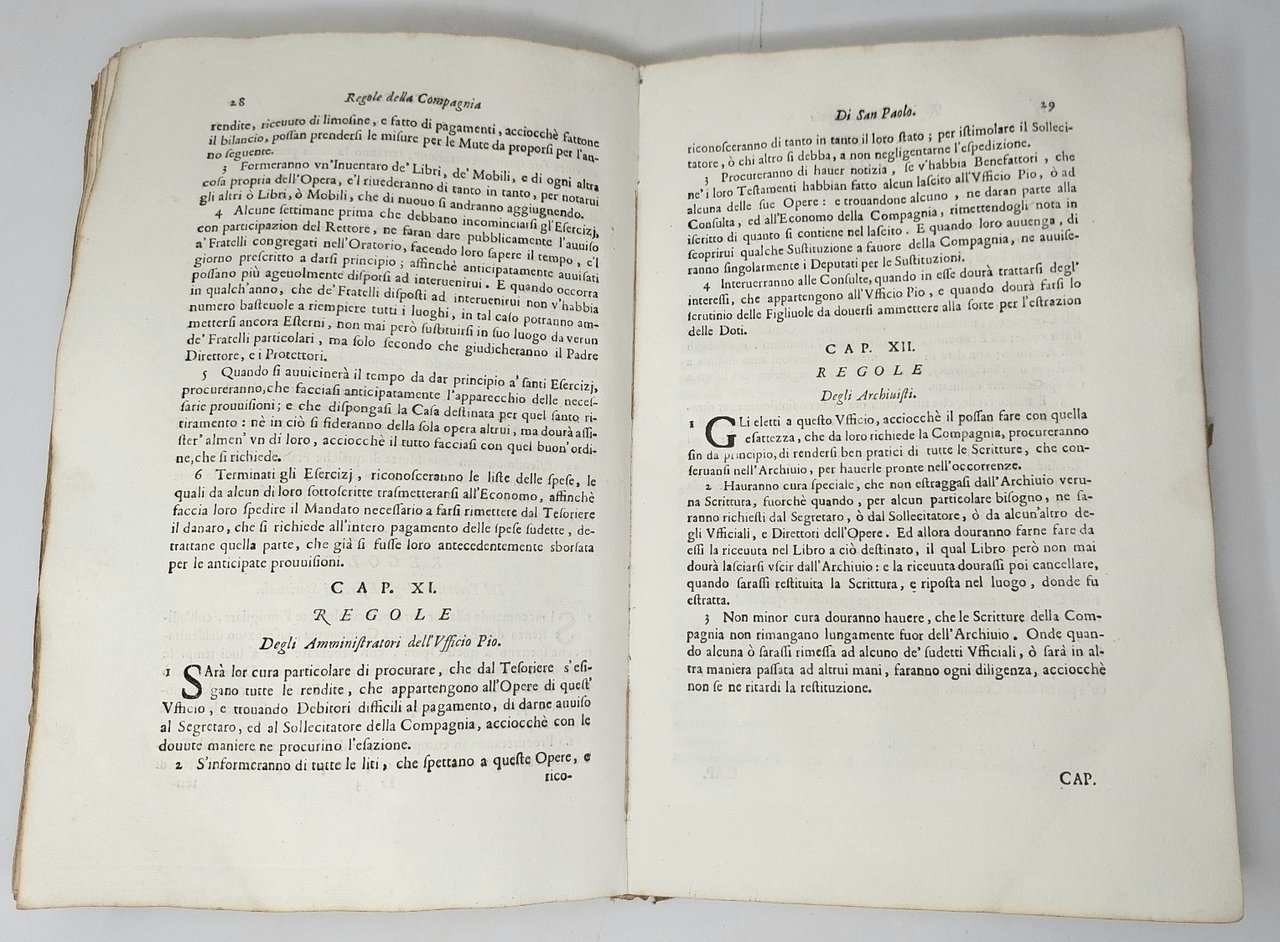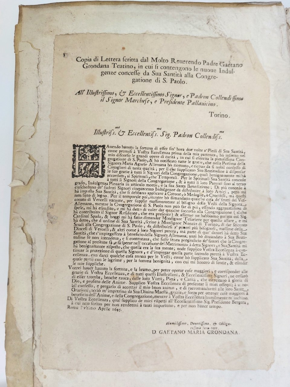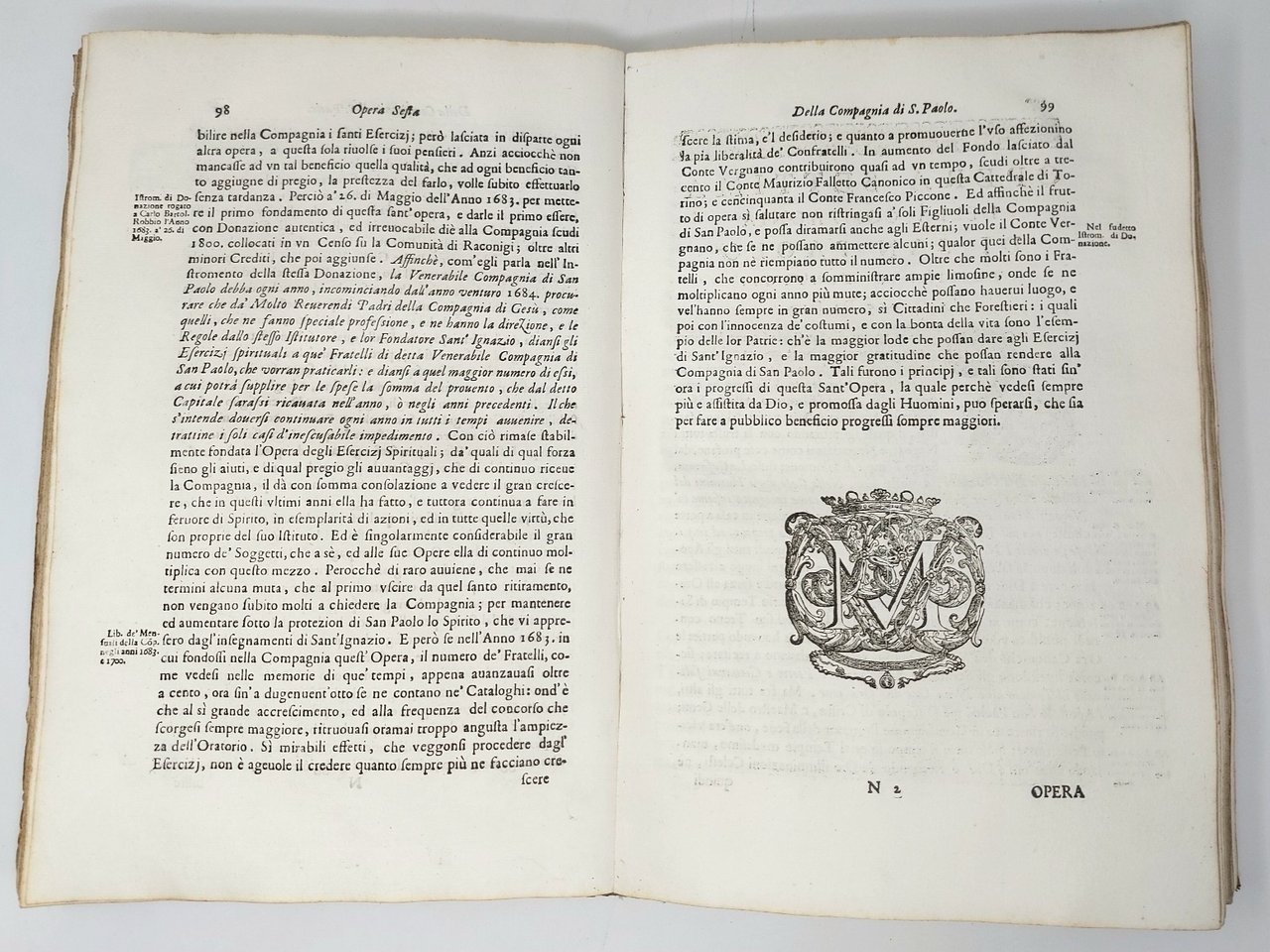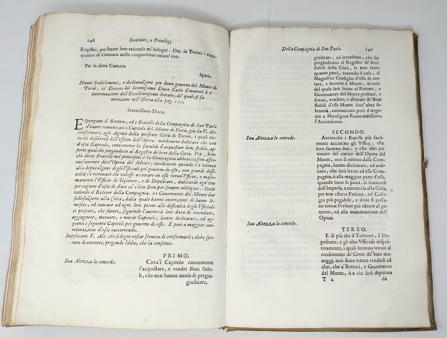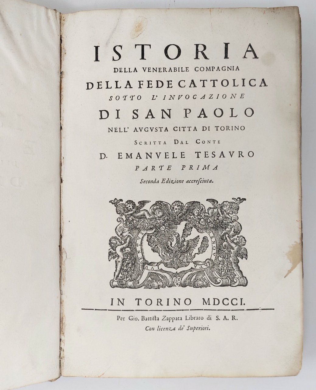 >2 parti in un vol. in-4 grande (350x230 mm), ff. (2, manca antiporta inciso.), pp. 138, (1bianca. mancante); pp. (4), 164, (4 di indice); legatura coeva in pergamena rigida, filetti oro ai piatti, titolo ms. al dorso (un po' sciupata e con macchie d'umido). Impresa tipografica sui frontespizi, testatine, finali e iniziali ornate. Seconda edizione, più corretta ed assai più vasta della prima apparsa nel 1657-58, dell'opera più importante e rara sulla Compagnia di San Paolo, oggi Istituto Bancario San Paolo di Torino. Nata nel 1563, in pieno clima di Controriforma, per arrestare il propagarsi dell'eresia protestante, in seguito la Compagnia si dedicò per lo più all'amministrazione dei ''Monti di pietà'' ed alle opere di carità ed assistenza, soprattutto contro la speculazione e l'usura. La prima parte si occupa della fondazione e dello sviluppo della Compagnia; la seconda dei privilegi, degli statuti, di scritture e documenti vari. Esemplare bello seppur mancante dell'antiporta (piccole macchie d'umido nel margine esterno delle prime 10 pp.), con note ms. di mano coeva alla controsguardia posteriore. Applicata al contropiatto anteriore "Copia di Lettera scritta dal Molto Reverendo Padre Gaetano Grondana Teatino, in cui si contengono le nuove Indulgenze concesse da Sua Santità alla Congregazione di San Paolo" (Roma, l'ultimo Aprile 1695). Kress Libr. S.2236. Kress Ital. 195. Cat. Einaudi 5572.