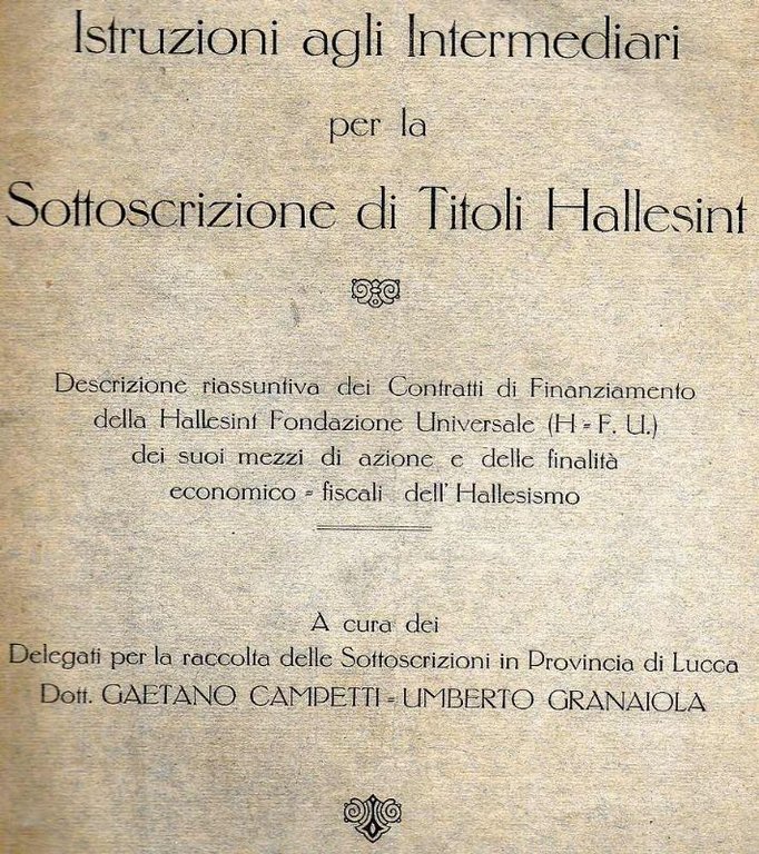 Istruzioni agli Intermediari per la Sottoscrizione di Titoli Hallesint. Descrizione riassuntiva dei Contratti di Finanziamento della Hallesint Fondazione Universale (H=F.U) dei suoi mezzi di azione e delle finalità economico - fiscali dell'Hallesismo.