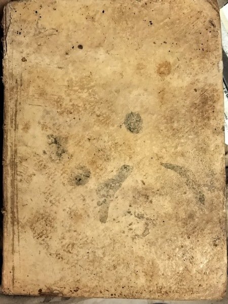 In 8°, p.perg., pp. XII + 527. Testata. Finaline. Capilettera. Front. fig. Appunti manoscritti sul front. Tracce di gore che, comunque, non ledono il t. Le pp. 481/482 e 483/484 presentano delle macchie di precaria identificazione, che, tuttavia, non ledono il t. Lievi mende alla cop. ed al d. (mancante di un lembo).