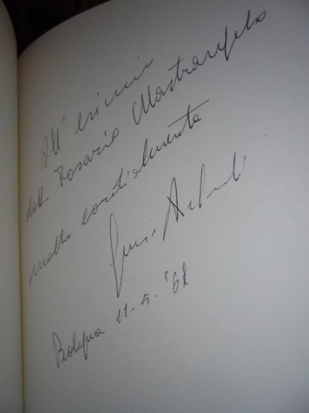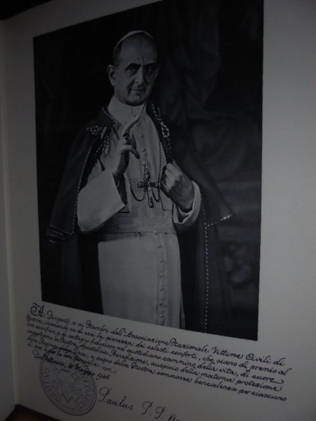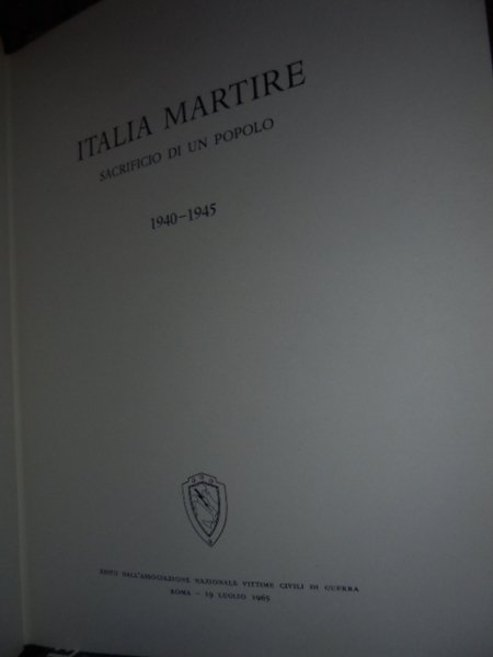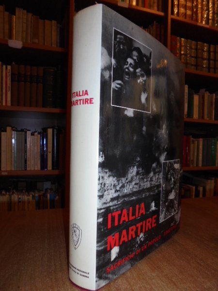 ITALIA Martire. Sacrificio di un Popolo 1940-1945. Roma, Associazione Nazionale Vittime Civili di Guerra. 19 Luglio, 1965. Seconda edizione ampiamente riveduta e corretta. In-4°, cartonato edit. con sovracopertina. 600, (4) pp. Contiene un vasto apparato fotografico in nero. Volume che ripercorre il dramma bellico delle città italiane, mettendo l'accento sulla sofferenza dei civili durante la Seconda Guerra Mondiale. Dedica firmata del presidente dell' Associazione Nazionale Vittime della guerra Giuseppe Arcaroli. In ottimo stato di conservazione o come nuovo. Neg. mob. dietr. stamp.