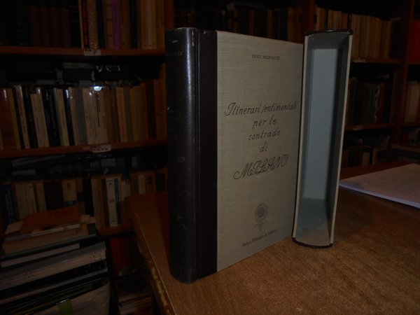 PAOLO MEZZANOTTE. Bergamo, Poligrafiche Bolis per Banca Popolare di Milano, 1985. Itinerari sentimentali per le contrade di Milano. 3 volumi in uno in-8°, m. pelle con titoli al dorso e sul piano anteriore. 798, (iv) pp. con centinaia di riproduzioni in bianco e nero di foto, antiche stampe e dipinti, anche a piena pagina. Ottimo esemplare con cofanetto in tela. Uff. stanzetta mob. sinistra I - 3 carc.