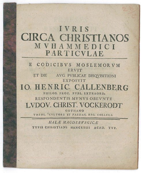 4to. (4), 18, (2) pp. Papered spine. Considered Callenberg's probably most scholarly work, a Halle disputation about Muslim laws respecting Christians. The respondent was Ludwig Christian Vockerodt, the son of Callenberg's former teacher in Gotha, Gottfried Vockerodt. With numerous notes in Arabic. The German orientalist and Lutheran professor of theology and philology Johann Heinrich Callenberg (1694-1760) tried to promote conversions among Jews and Muslims. For this purpose he founded (in 1728) the "Institutum Judaicum et Muhammedicum", which also produced oriental-language translations of Christian tracts. - Well preserved. - GAL S I, 347.
