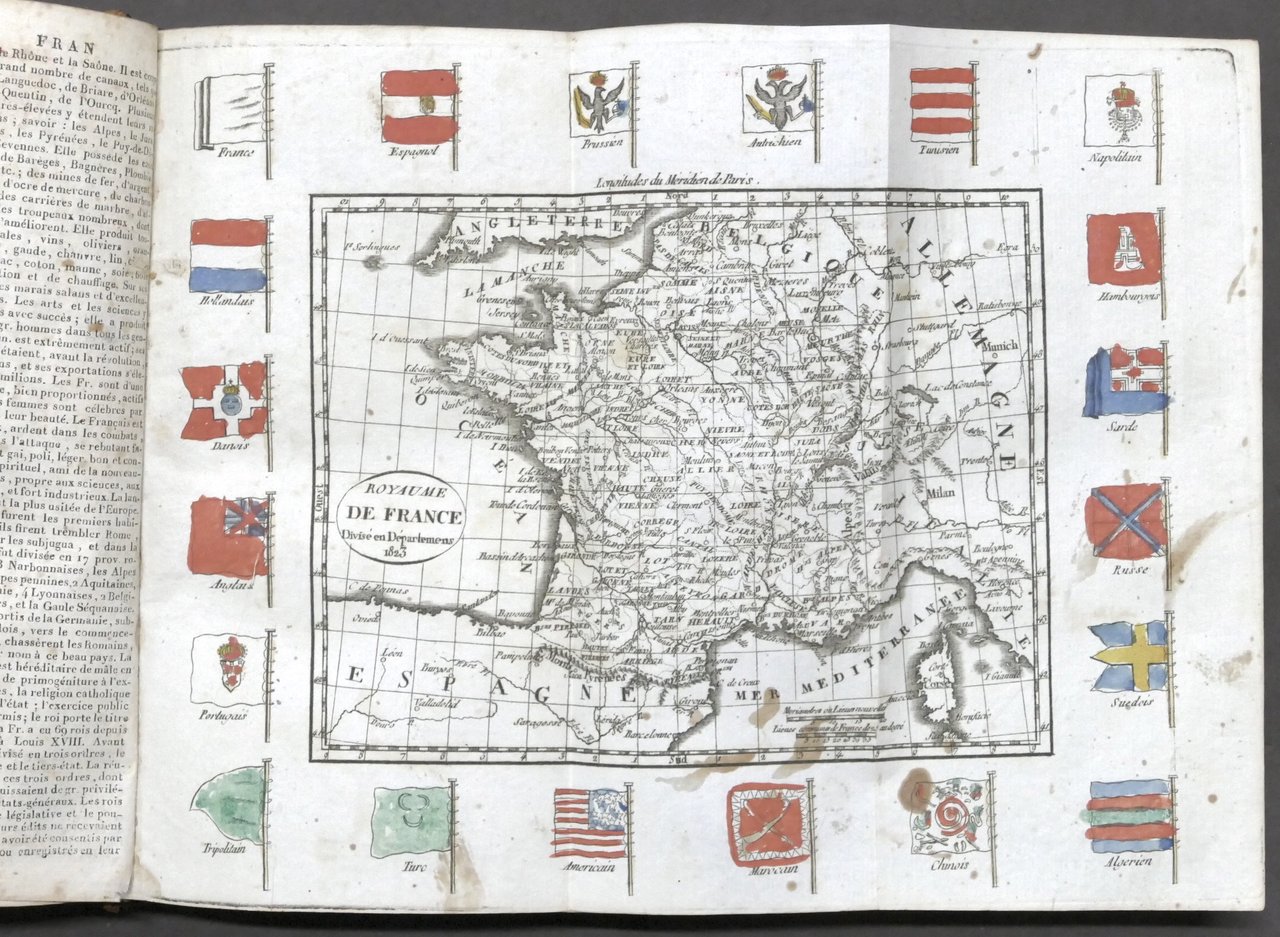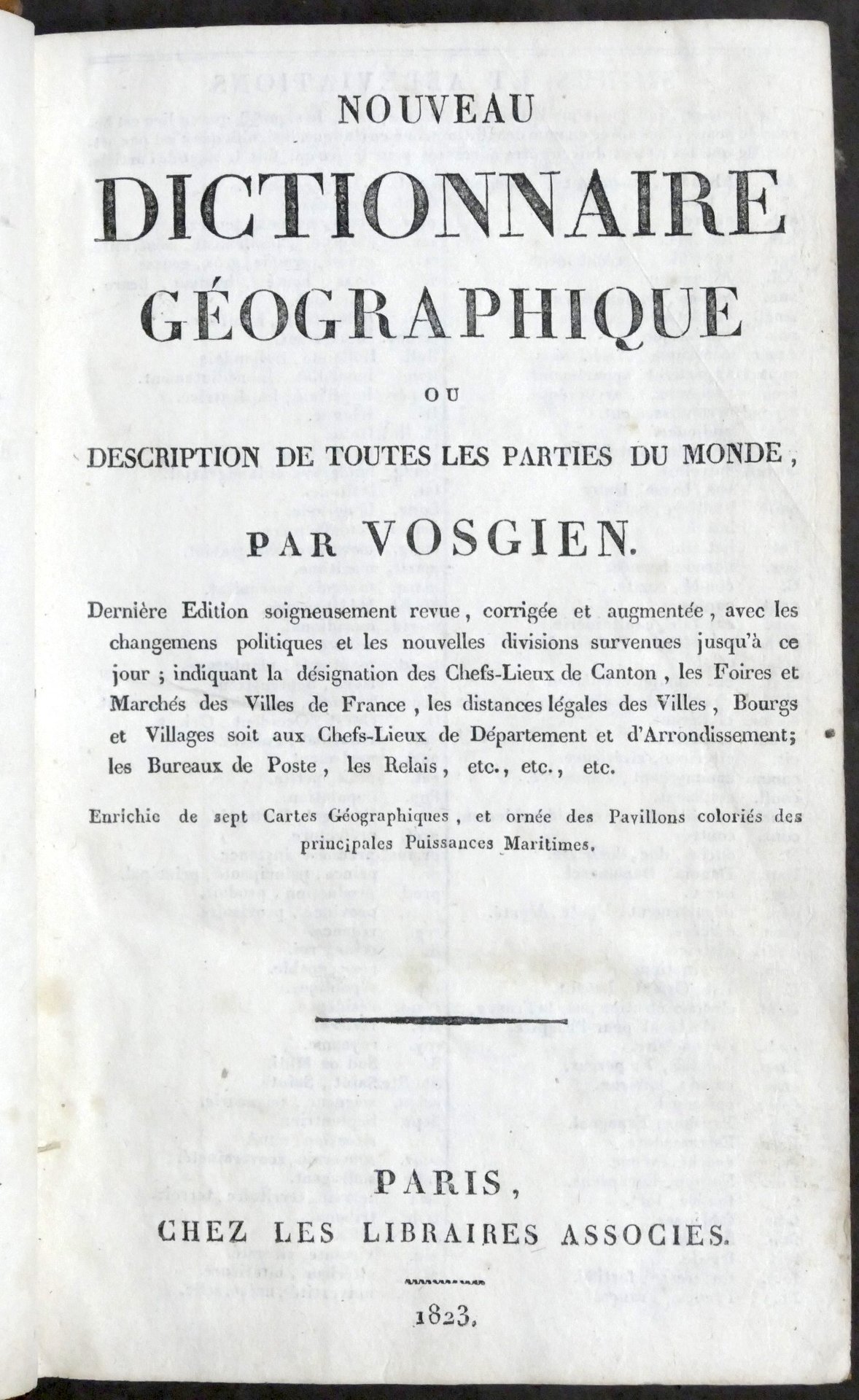 Jean Baptiste Ladvocat - Nouveau dictionnaire géographique, ou Description de toutes les parties du monde, par Vosgien - Derniere edition soigneusement revue, corrigée et augmentée . Enrichie de sept cartes geographiques . Paris, chez Libraires Associes, 1823 Pag. [4], 684; con 7 carte geografiche ripiegate alcune colorate a mano  Legatura in piena pelle - Testo in francese.  Condizioni generali buone. Piccoli segni del tempo. Â