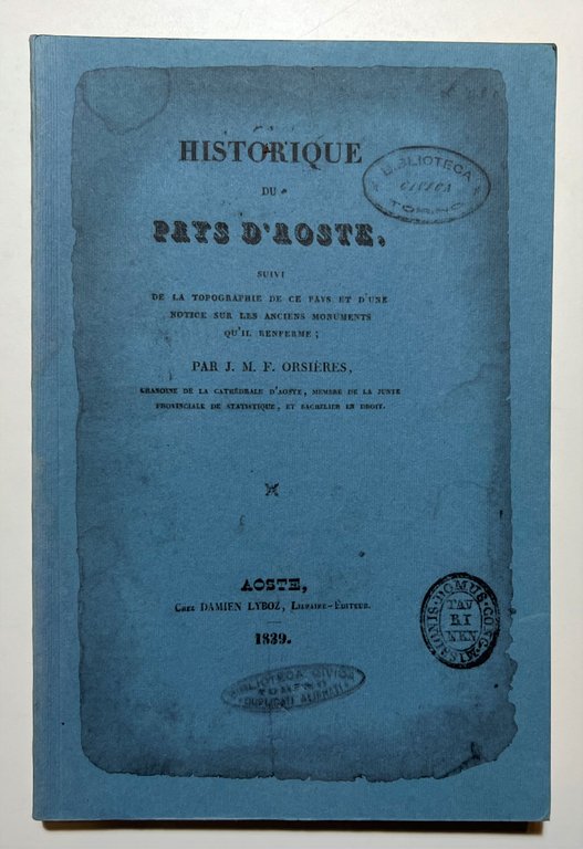 J. M. F. Orsières - Historiques du Pays D'Aoste - ed. 1839 Ristampa 1997Testo in lingua italiana. Pagine 172 Copertina morbida. Condizioni molto buone.