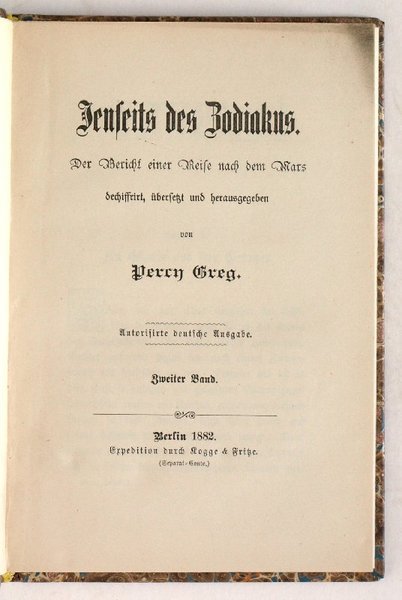 Jenseits des Zodiakus. Der Bericht einer Reise nach dem Mars dechiffriert, übersetzt und herausgegeben von Percy Greg. Zweiter (-dritter) Band.