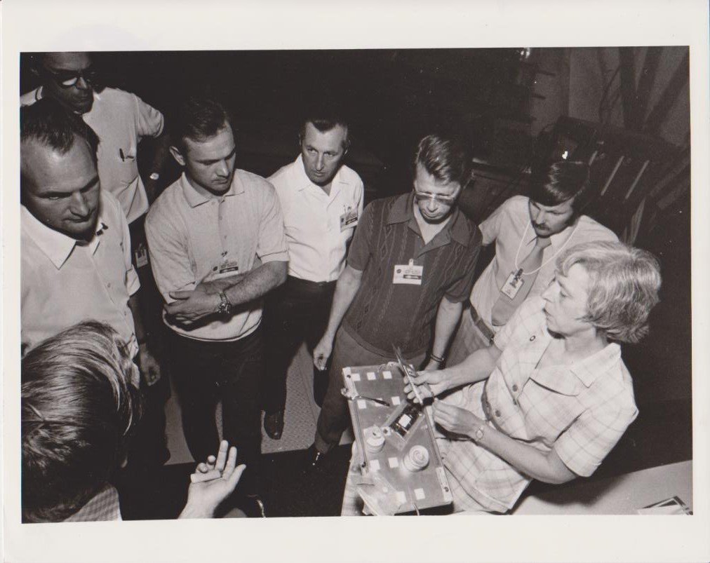 Vintage print, al verso timbro della Nasa (National Aeronautics and Space Administration), testo dattiloscritto in INglese, etichetta per la catalogazione, alcuni segni a pennarello. La fotografia ritrae Rita Rapp, Food Coordinator della Biomedical Reserch Division del Johnson Space Center, spiegare agli astronauti l'utilizzo e lo smaltimento del cibo a bordo della Stazione Spaziale del progetto Apollo Soyuz Test Project.