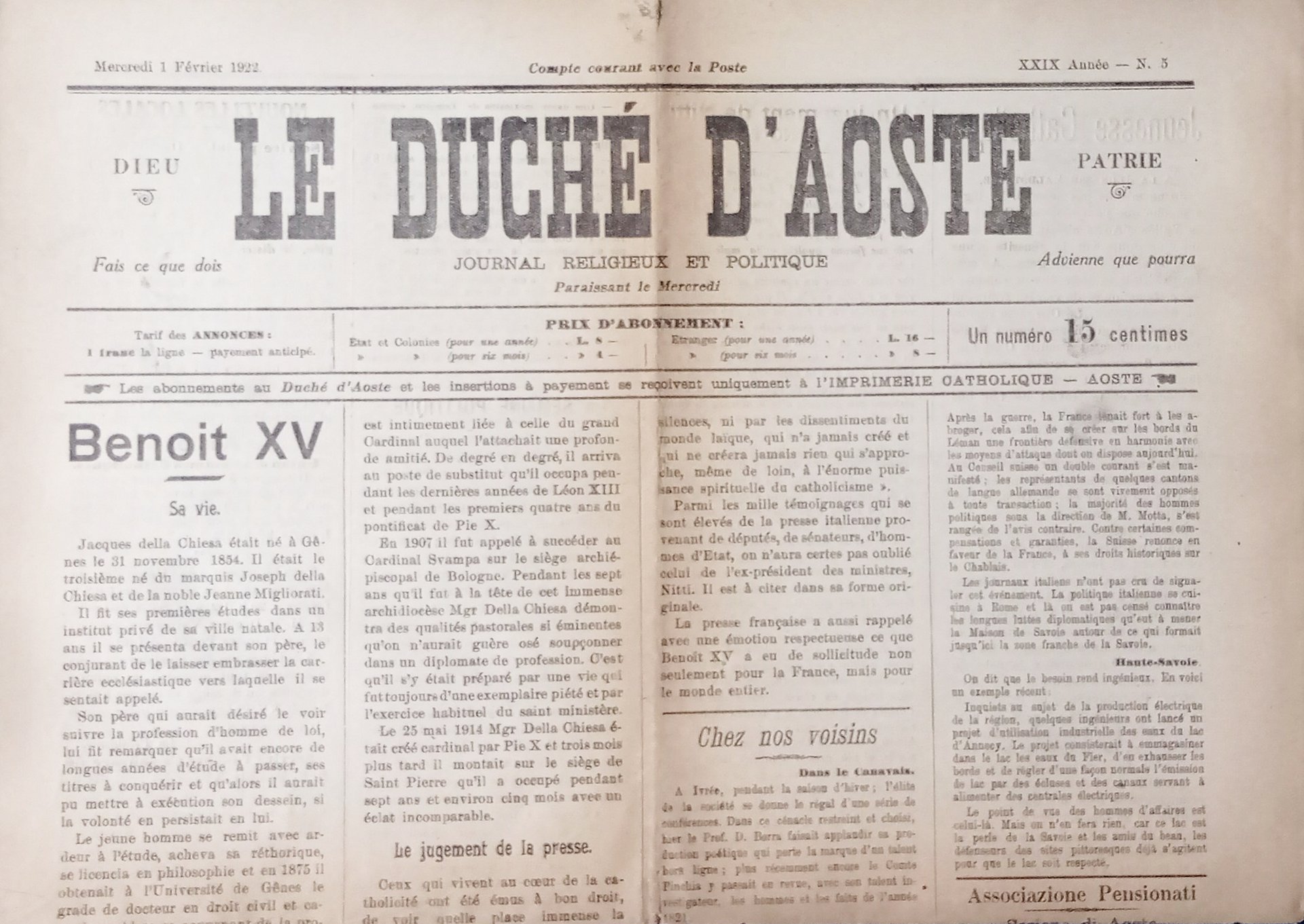 Journal Religieux et Politique - Le Duchè d'Aoste N. 5 - Benoit XV - 1922