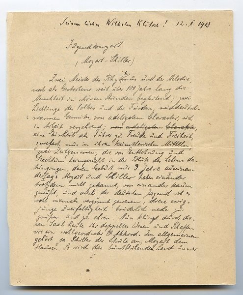 5 SS. auf 5 Bll. Kl.-4to. Zwei Meister des Rhythmus und der Melodie, noch als Gestorbene weit über 100 Jahre lang die Menschheit in schönen Stunden begleitend; zwei Lieblinge des Volkes und der Fürsten, süddeutsch-warmen Gemütes, von adeligstem Charakter, sich in Arbeit verzehrend; eine Einheit als Führer zu Freude und Freiheit, zwiefach nur in ihren künstlerischen Mitteln; zwei Zeitgenossen, die von Entbehrung und Siechtum heimgesucht in der Blüte des Lebens dahingingen, deren Geburt nur 3 Jahre auseinanderlag: Mozart und Schiller haben einander trotzdem nicht gekannt, von einander kaum gewußt, und auch der deutschen Jugend ist es wohl niemals vergönnt gewesen, diese ewig-junge Zweifaltigkeit brüderlich nahe zu grüßen und zu ehren [.]. - Von 1901 bis 1910 als Schauspieler und Regisseur am Wiener Burgtheater tätig, wechselte Ferdinand Gregori 1910 nach Mannheim und 1916 nach Berlin als Schauspieler und Spielleiter am Deutschen Theater Max Reinhardts sowie als Lehrer an die angeschlossene Schauspielschule. Von 1918 bis 1923 saß er der Vereinigung künstlerischer Bühnenvorstände vor und gab deren Monatsschrift "Die Scene" heraus. - Bl. 1 recto mit eh. Widmung an den Schauspieler und Regisseur Wilhelm Klitsch (1882-1941); trotz des etwas kryptischen eh. Zusatzes "abgeschrieben von meiner Frau" (Bl. 5 recto), stammt das vorliegende Manuskript a. d. H. v. Ferdinand Gregori; einer (hier nicht beiliegenden) alten Antiquariatsbeschreibung zufolge, hatte Wilhelm Klitsch Gregoris Worte über Mozart und Schiller anläßlich eines Konzerts für die Jugend gesprochen.