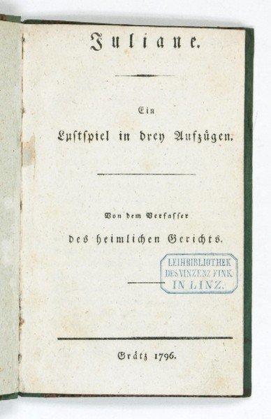 104 SS. Halbleinenband des 19. Jh.s mit hs. Bibliotheksschildchen am Rücken. 12mo. Grazer Raubdruck des 1794 in Berlin erschienenen Dramas. Der in Paris geborene Schriftsteller L. F. Huber (1764-1804) stand seit 1782 in Verbindung mit Chr. G. Körner und Schiller, “unter dessen Einfluß er das Drama ‘Das heimliche Gericht’ (1790) verfaßte. 1788 ging er als sächsischer Legationssekretär nach Mainz, wurde 1789 Ministerialresident und lernte Georg und Therese Forster kennen. Als Befürworter der Französischen Revolution geriet Huber in den Verdacht der Konspiration und zog, inzwischen mit Therese Forster liiert (Heirat 1794), in die Schweiz. Während des Aufenthalts in Neuchâtel und Bôle war er als Übersetzer tätig und gab u.a. die Zeitschrift ‘Friedens-Präliminarien’ (1794-96) heraus. Nach Deutschland zurückgekehrt, wirkte er seit 1798 als Redakteur von Cottas ‘Neuester Weltkunde’ in Tübingen [.] Als Dramatiker wenig erfolgreich, hatte er als literarischer Kritiker und politischer Publizist Bedeutung” (DBE). - Stempel der “Leihbibliothek des Vinzenz Fink Linz” am Titel. Der Verlagsbuchhändler Fink (1807-77) war 1856-61 auch Bürgermeister von Linz. Gutes, kaum fleckiges Exemplar. - Vgl. Holzmann/Bohatta II, 11494. Vgl. Goedeke V, 482, 13.