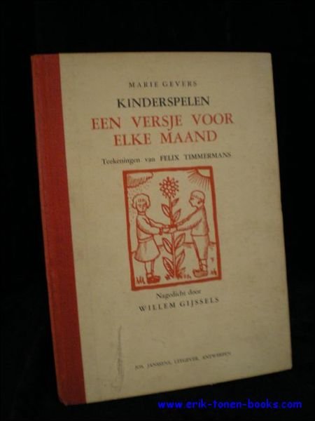 Gebonden, rood halflinnen en geillustreerd karton, titelpagina met vignet, 150 x 215mm., 37pp., geillustreerd. Teekeningen van Felix Timmermans. Nagedicht door Willem Gijssels. In goede staat.