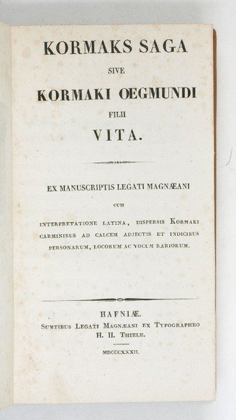 Kormaks Saga sive Kormaki Oegmundi filii vita. Ex manuscriptis leganti magnaeani cum interpretatione Latina, dispersis Kormaki carminibus ad Calcem adjectis et indicibus personarum, locorum ac vocum rariorum.