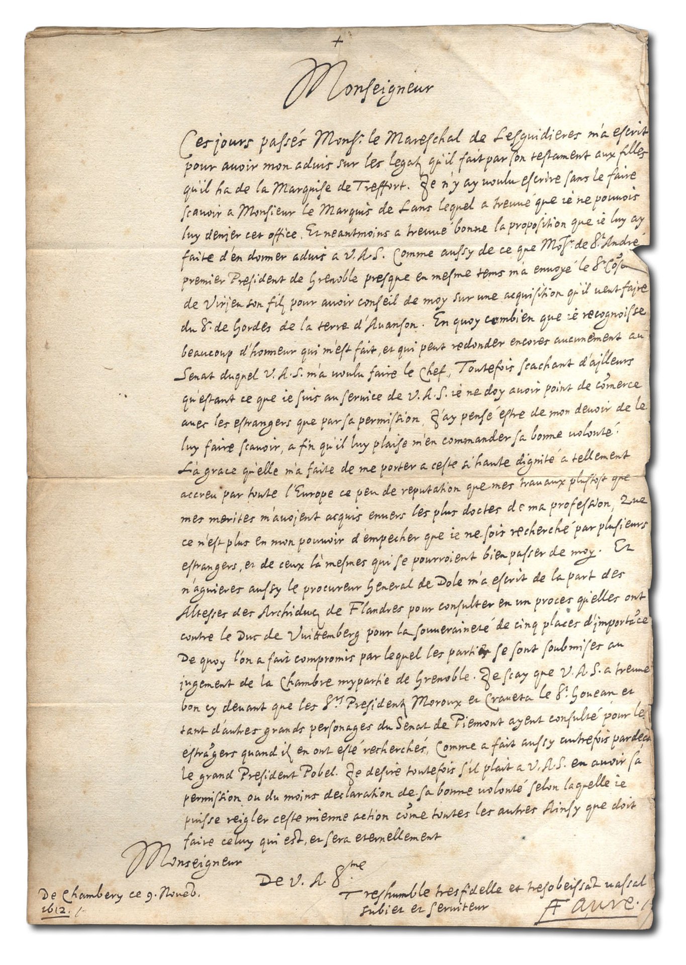 >1 p. in-folio. Lettera autografa firmata dal celebre giureconsulto francese Favre ad un anonimo ''Monseigneur''. Notevole spaccato dell'attività diplomatica di una sede relativamente decentrata ma fulcro di importanti contatti internazionali. ''Ces jours passés Mons. le Mareschal de Lesquidieres m'a escrit pour avoir mon advis sur les legats qu'ils fait pars son testament aux filles qu'il ha de la Marquise de Treffort...le Procureur Generale de Dole m'a ecrit par la parte des Altesses...''.
