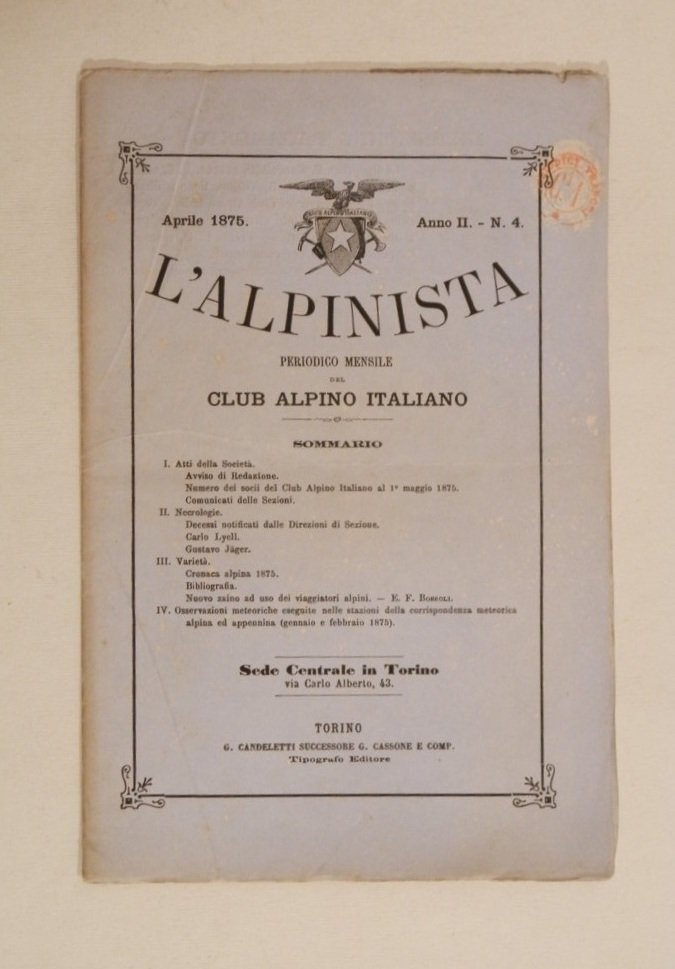 L'Alpinista. Periodico Mensile del Club Alpino Italiano. Aprile 1875, anno II, n. 4.