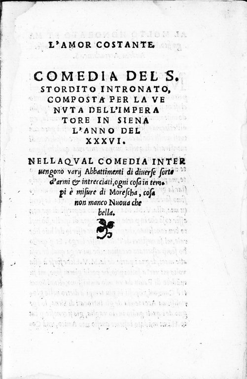 L'amor costante. Comedia del S. Stordito Intronato, composta per la venuta dell'Imperatore in Siena l'anno del XXXVI. Nella qual comedia intervengono varij abbattimenti di diverse sorte d'armi et intrcciati, ogni cosa in tempi e misure di Morescha, cosa non manco nuova che bella.