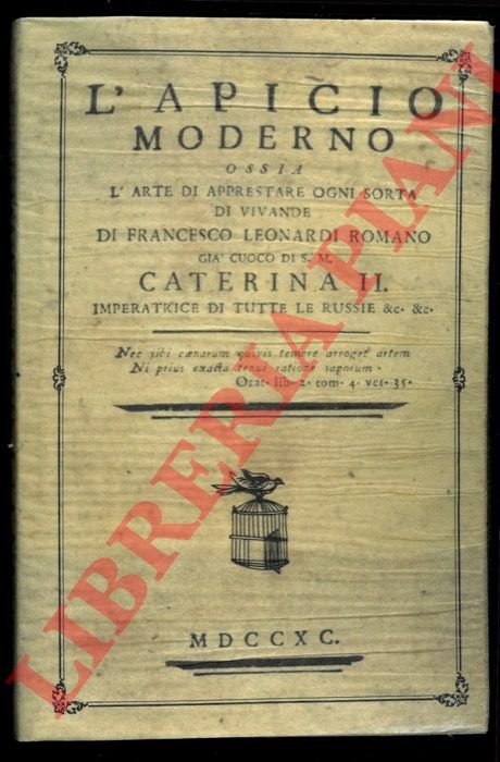 LOdi, Studio Bibliografico Zazzera, 1999 (anastatica dell'edizione del 1790) sei volumi in-8vo (cm. 13,5 x 21) cartonato con sovraccopertina illustrata, pp. (10)-VIII-259 + LXX-248 + 350 + 327 + XVI-290 + 325. Tiratura di 500 esemplari numerati. In stato di nuovo. Con la stampa dell'Apicio Moderno nel 1790, Leonardi sfida i francesi sul loro stesso terreno e rivela che in ogni città europea è possibile apparecchiare una tavola principesca, superando i modelli e inventando nuovi piatti. E' infatti ai cuochi delle corti e delle case italiane che l'opera si indirizza, adattando all'italiano il lessico professionale e i titoli delle ricette parigine. Il cosmopolitismo di Leonardi gli consente di dimostrare come sia duttile il modello francese, o almeno, come possa essere adeguato alle esigenze e alla borsa di semplici famiglie e di modeste fortune. Passando dallo stile aristocratico a quello borghese e da questo risalendo al precedente, ristudia le ricette in funzione delle produzioni locali, dei mercati e dei commerci. L'Apicio è la somma di tutte queste esperienze, il diario di un cuoco-viaggiatore e di una cuoca di locanda, di uno chef moderno e di uno scalco antico.