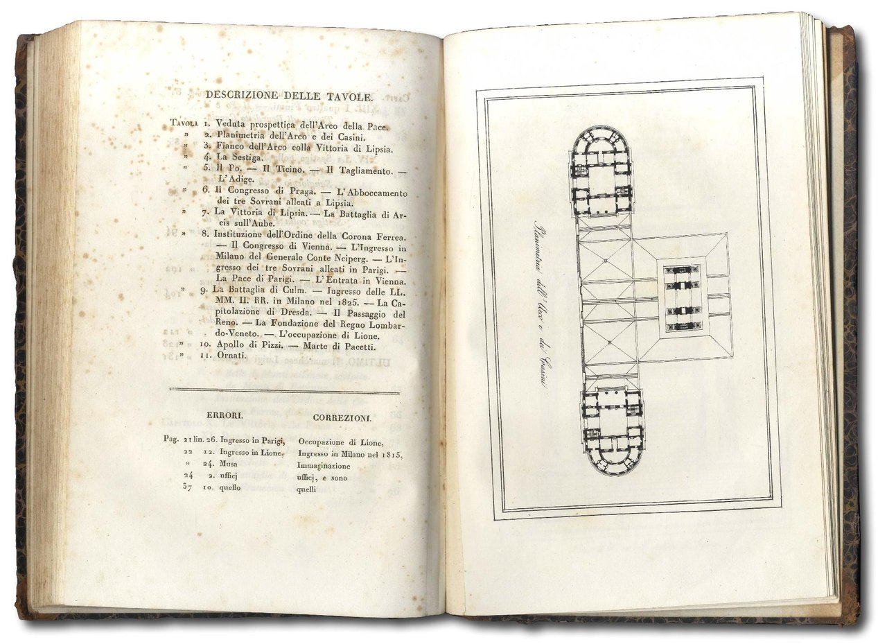 >in-8, pp. VIII, 143, (5), leg. del tempo m. pelle e ang., tit. oro al dorso (difetti alle cerniere). Antiporta con suggestiva veduta prospettica in litografia dis. da G. Elena e 10 tav. f.t. incise al tratto raffig. la pianta ed i particolari del grande monumento. Esemplare marginoso, lievi fioriture sparse. Manca al Cat. Meneghina. Predari 447. Cat. Hoepli 1364.