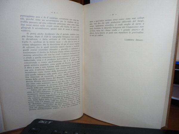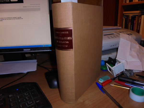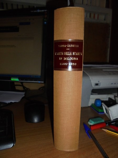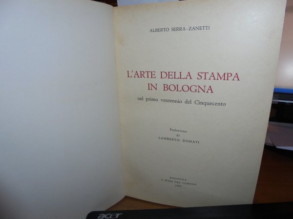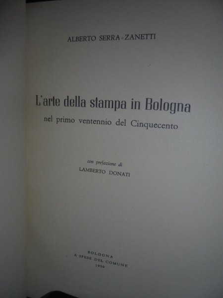 Alberto Serra-Zanetti. Bologna, a spese del Comune, 1959. L' Arte della Stampa in Bologna nel primo ventennio del Cinquecento. In-8°, tela con titolo in oro al dorso, copertine originali conservate. xvi, 478 pp. Uff. E - I - 5 - 2