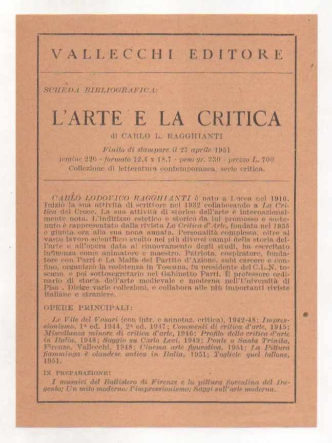 LIBROPrima edizione. Ottimo esemplare. Conserva la cedola di «Omaggio dell’autore e dell’editore» e la scheda bibliografica editoriale.«Saggio della raggiunta maturità, in cui il crocianesimo si trasforma in una personale metodologia applicata all’universo del visivo [.] che fonda la dorsale del suo percorso critico nel trentennio successivo» (Pellegrini, «Ragghianti», voce del «Dizionario biografico degli Italiani», volume 86, 2016).