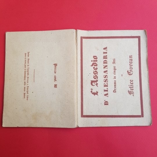 In-16°, pp.104, bella e curiosa brossura xilografica con il titolo dell'opera al piatto superiore stampato orizzantalmente. La messa in scena dell'opera venne proibita poichè scritto all'indomani dell'ingresso dei soldati austriaci nella città e la cui rappresentazione avrebbe potuto favorire un turbamento dell'ordine pubblico