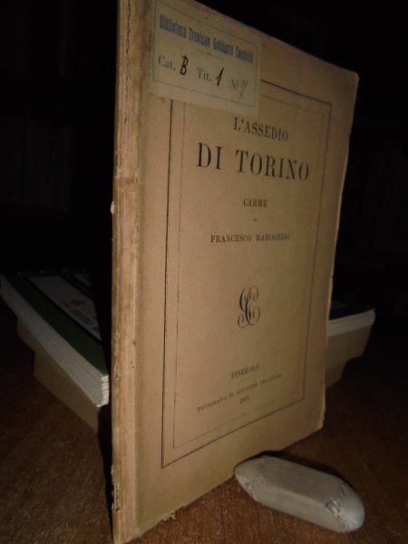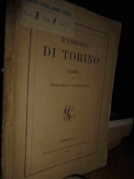L' Assedio di Torino. Carme di Francesco Ramognini. Pinerolo, Tipografia di Giuseppe Chiantore, 1873. In-16°, br., 77 pp. Ben conservato. Etichetta ex Libris nel piano ant. Neg. mob. 3