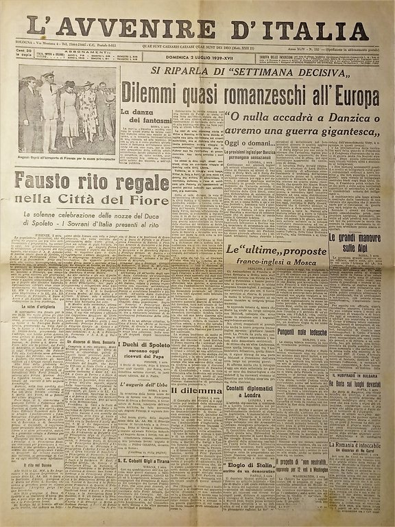 Quotidiano - L'Avvenire d'Italia N. 152 - Fausto rito regale nella Città del Fiore - 1939 Testo in lingua italiana. Pagine 6 con illustrazioni. Condizioni buone con piccoli segni del tempo come da foto. Â