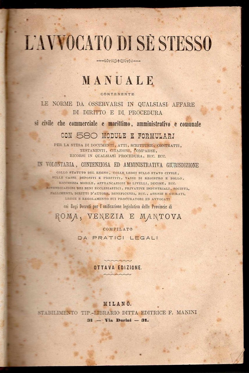 L'avvocato di sé stesso - Manuale contenente le norme da osservarsi in qualunque affare di diritto e di procedura si civile che commerciale e marittimo, amministrativo e comunale con 580 module e formulari