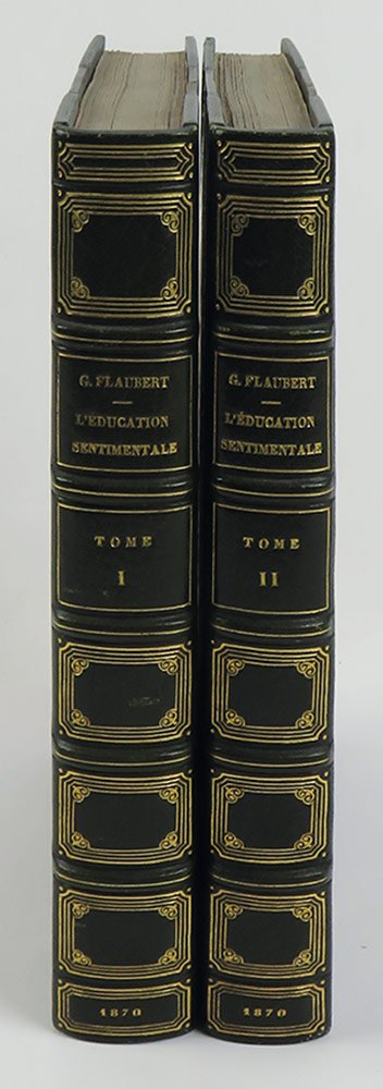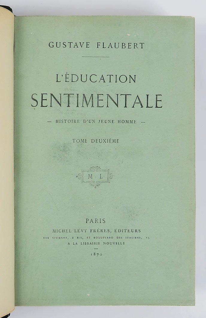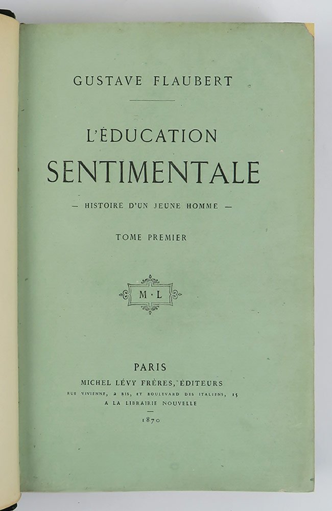 LIBROPrima edizione, prima tiratura. Esemplari a pieni margini, in ottime condizioni, freschissimi e puliti, conserva le brossure originali (applicate su carta di rinforzo); raro in queste condizioni, specie completo del catalogo editoriale in fine al secondo volume.Prima edizione nella prima tiratura, riconoscibile dall’assenza al frontespizio della menzione di edizione. «L'educazione sentimentale», romanzo di impronta fortemente autobiografica, vede come protagonista Frédéric, chiaramente modellato sullo stesso Flaubert. L'attinenza con gli avvenimenti biografici dell’autore è talmente radicata che l'intimo amico Du Camp scrisse nei suoi «Souvenirs littéraires»: «il n’est pas un des acteurs que je ne puisse nommer, je les ai tous connus ou côtoyés». Si tratta del romanzo su cui Flaubert meditò più a lungo: la sua gestazione risale addirittura al 1838 quando espresse nelle «Mémoires d'un fou» (stese a sedici anni e pubblicate solo postume) il desiderio di scrivere un romanzo sulla propria vita; seguì poi il romanzo breve «Novembre» (1842, pubblicato anch’esso dopo la morte dell’autore), considerato dalla critica una tappa centrale della nascita dell’«Éducation sentimentale». Per il primo abbozzo autografo sotto il titolo definitivo occorrerà attendere il 1843. Flaubert cominciò però a lavorare a tempo pieno al suo romanzo soltanto nel 1864, dopo aver pubblicato «Salammbô»; la scrittura impegnò l’autore per circa 5 anni, come testimonia il manoscritto inviato in tipografia, che porta le date 1864-1869. Tra i più noti romanzi di formazione della letteratura europea, fu subito amato da grandi autori come Théodore de Banville ed Émile Zola, ma venne accolto inizialmente con molta freddezza dalla critica; alle soglie del Novecento si impose definitivamente come un classico della letteratura europea.Talvart - Place, vol. VI, n. 3a (p. 6); Carteret, vol. I p. 268; Flaubert, Oeuvres (Gallimard 1958), vol. II, pp. 13-30.