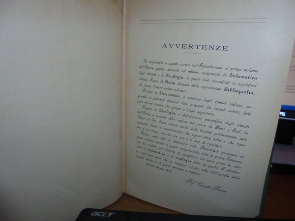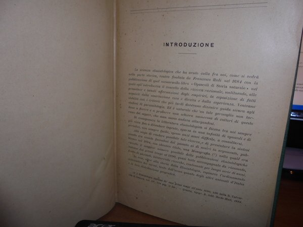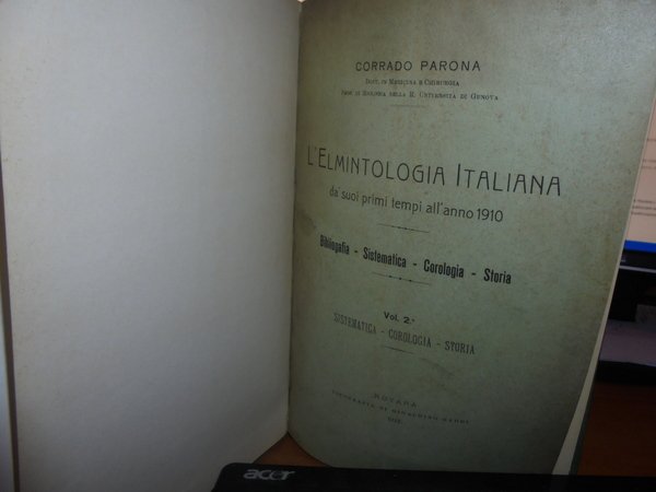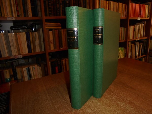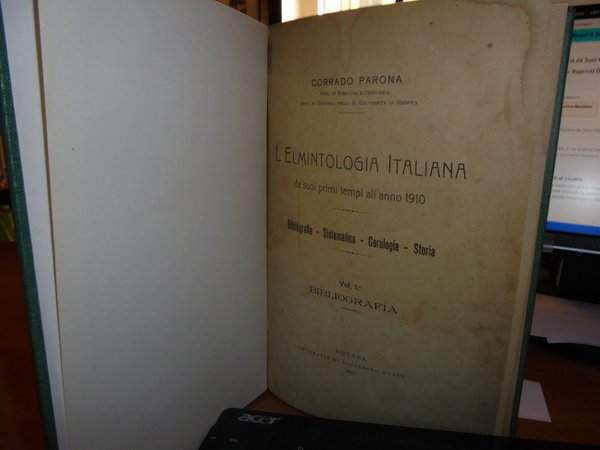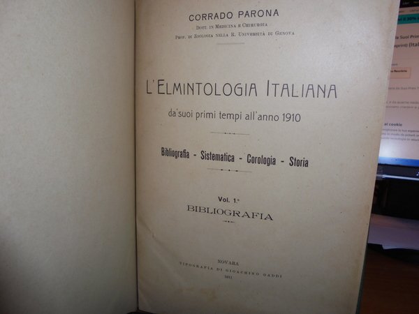 CORRADO, PARONA. Novara, Tipografia di Gioachino Gaddi, 1911 - 1912. L' ELMINTOLOGIA ITALIANA da' suoi primi tempi all' anno 1910. 2 volumi in-8° grande, tela verde con titoli in oro entro tasselli ai dorsi, brossure originali conservate. 502, 540 pp. Uff. A - I - 3