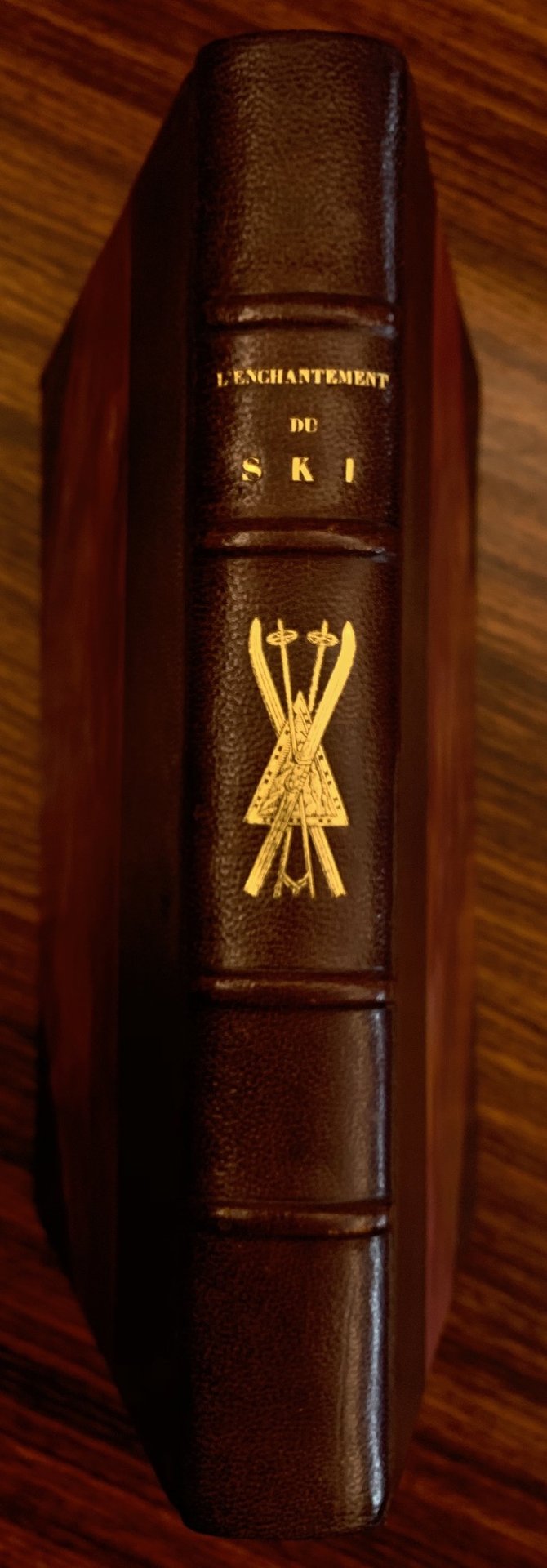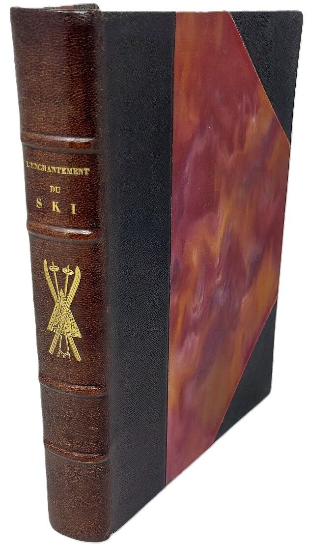 >in-8, pp. 155, (5); bellissima legatura d'amatore mezza pelle ed angoli, titolo e ricchi fregi in stile alpino impressi in oro al dorso, brossura editoriale figurata conservata, illustrata da Maurius Hubert-Robert . Introduzione di Henry Cuenot, Président de la FédérationFrançais de ski. Bellissima edizione riccamente illustrata in bianco e nero ed a colori. Tiratura limitata di 500 copie (es. 53). “L'enchantement du ski” descrive un viaggio nel magico mondo dello sci . Il tono è al tempo stesso poetico e documentato, mettendo in risalto non solo le prestazioni, ma anche la bellezza delle piste, la luce, il silenzio della montagna e la trasformazione dell'uomo attraverso questa attività sportiva. Esemplare ben conservato.