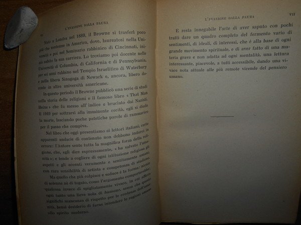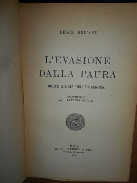LEWIS, Browne. Bari, Gius. Laterza & Figli, 1952. L' Evasione dalla paura. Breve storia delle religioni. In-8°, br. orig. vii, 220 pp. In ottimo stato di conservazione con barbe. Neg. Mass. mob. 1
