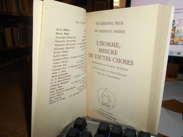 SRI KRISHNA PREM / SRI MADHAVA ASHISH. Monaco, Editions Du Rocher, 1980. L'HOMME MESURE DE TOUTES CHOSES: COMMENTAIRES SUR LES STANCES DE DZYAN. In-16° grande, cartoncino edit. con alette. 397, (1) pp. In ottimo stato di conservazione. Uff. stanzetta mob. piccolo a destra