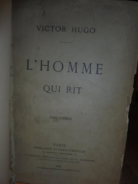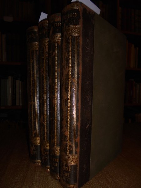 Victor, Hugo. Paris, Librairie Internationale18, Boulevard Montmartre, 15. A. Lacroix, Verboeckhoven et C, éditeurs a Bruxelles, a Leipzig et a Livourne, 1869. L' HOMME qui rit. 4 volumi in-8°, m. pelle coeva con fregi e titoli in oro nei dorsi. 419, (1) pp.; 334, (1) pp.; 324, (1) pp.; 420, (1) pp. Lievi spellature ai dorsi ma ben conservato. L'uomo che ride è un romanzo di Victor Hugo, pubblicato nell'aprile 1869. ÉDITION ORIGINALE française parue en même temps que l'édition belge chez Lacroix et Verboeckhoven à Bruxelles. Les grandes oeuvres littéraires de l'exil ont donné lieu, selon la volonté expresse de Victor Hugo, à des éditions doublées. L'une, imprimée à Paris, était destinée à la France, l'autre, publiée à Bruxelles, était réservée à l'étranger. Ces éditions étaient régies par un même contrat et Hugo tenait à ce qu'elles sortissent le même jour. « Cette oeuvre écrite dans la dernière période de l'exil à Bruxelles reflète, comme "Les Misérables", les préoccupations sociales qui avaient fait de Victor Hugo un homme politique, et sa passion, à la fois naïve et ardente, donne à ces pages un accent inoubliable. "L'Homme qui rit" est peut-être le roman le plus typique de Victor Hugo, celui dans lequel son goût pour l'antithèse est mis le plus clairement au service d'une idéologie. Un saltimbanque philosophe, un monstre à l'âme lumineuse, une orpheline aveugle d'une pureté exceptionnelle, une duchesse pervertie, tels sont les protagonistes de ce roman. L'action se passe en Angleterre, au temps de la reine Anne. [.]. L'évocation de la vieille Angleterre du début du XVIIIe siècle est loin de manquer de force : la brutalité populaire explose sous le vernis d'un orgueilleux raffinement. » Ottimo esemplare. Neg.