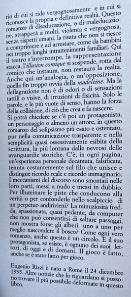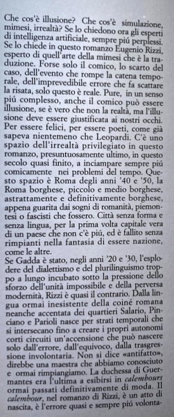 Che cos'è illusione? Che cos'è simulazione, mimesi, irrealtà? Se lo chiedono ora gli esperti di intelligenza artificiale, sempre più perplessi. Se lo chiede in questo romanzo Eugenio Rizzi, esperto di quell'arte della mimesi che è la traduzione. Forse solo il comico, lo scarto del caso, dell’evento che rompe la catena temporale, dell'imprevedibile errore, che fa scattare la risata, solo questo reale. Pure, in un senso più complesso, anche il comico può essere illusione, se è vero che non la realtà, ma l’illusione deve essere giustificata ai nostri occhi….Per essere felici, per essere poeti, come già sapeva nientemeno che Leopardi. C'è uno spazio dell'irrealtà privilegiato in questo romanzo, presuntuosamente ultimo, in questo secolo quasi finito, a inciampare sempre più comicamente nei problemi del tempo. Questo spazio è Roma degli anni '40 e '50, la Roma borghese, piccolo e medio borghese, astrattamente e definitivamente borghese, appena guarita dai sogni di romanità, piemontesi o fascisti che fossero. Città senza forma e senza lingua, per la prima volta capitale vera di un paese che non c'è più, ed è fallito senza rimpianti nella fantasia di essere nazione, come le altre. Se Gadda è stato, negli anni '20 e '30, l'esplodere del dialettismo e del plurilinguismo troppo a lungo incubato sotto la pressione dello sforzo dell'unità impossibile e della perversa modernità, Rizzi è quasi il contrario. Dalla lingua ormai inesistente della koinè romana neanche accentata dei quartieri Salario, Pinciano e Parioli nasce per strati temporali che si intersecano fino a creare i propri autonomi corti circuiti un'accensione che può nascere solo dall'errore, dall'equivoco, dalla trasgressione involontaria. Non si dice «antifatto», direbbe una maestra che abbiamo conosciuto e ormai rimpiangiamo. La duchessa di Guermantes era l'ultima a esibirsi in calembours ormai passati definitivamente di moda. Il calembour, nel romanzo di Rizzi, è un atto di nascita, è l'errore quasi e sempre più volontario di cui si ride vergognosamente e in cui si riconosce la propria e definitiva realtà. Questo romanzo di diseducazione, o di maleducazione, strapperà a molti, violenta e vergognosa, senza rispetti umani, la risata che non si riesce a comprimere e ad arrestare, come da barbini nei troppo lunghi intrattenimenti familiari. Qui il teatro s'interrompe, la rappresentazione stacca, l'illusion comique si sospende, rotta dal comico che instaura, non restaura la realtà. Anche qui un'analogia, o un'opposizione, quella fin troppo ovvia della madeleine. Ma la deflagrazione non è di odori o di sensazioni tattili o visive, di irruzioni di fisicità. Solo le parole, e le più vuote di senso, hanno la forza della collisione, di ciò che crea e fa nascere. Si potrà chiedere se c'è poi un protagonista, un personaggio o almeno un attore, in questo romanzo del solipsismo più osato e ostentato, pur nella comunicazione trasparente e nella semplicità quasi ossessivamente esibita della scrittura, la più lontana dalle nevrosi delle avanguardie storiche. C'è, in ogni pagina, un'esperienza personale decantata, falsificata, tenuta costantemente sul filo che unisce e distingue ricordo reale e ricordo immaginario. I meccanismi del discorso sono smontati nelle loro parti, messi a nudo e messi in dubbio. Per illuminare le piste che conducono alla verità o per confonderle nello scalpiccio di un perpetuo andirivieni? La minuziosità fredda, spassionata, quasi pedante, da computer che non può consentirsi di saltare passaggi, non mostra forse gli alberi uno a uno per meglio nascondere il bosco? Come ogni vero romanzo, anche questo è un circolo. E il suo protagonista, se esiste, è ognuno dei suoi lettori, di oggi e di domani. Il gioco è fatto, anche se è stato fatto per gioco. Eugenio Rizzi è nato a Roma il 24 dicembre 1935. Altre notizie che lo riguardano si possono trovare il più possibile deformate in questo libro.