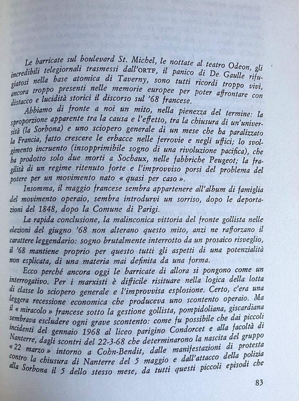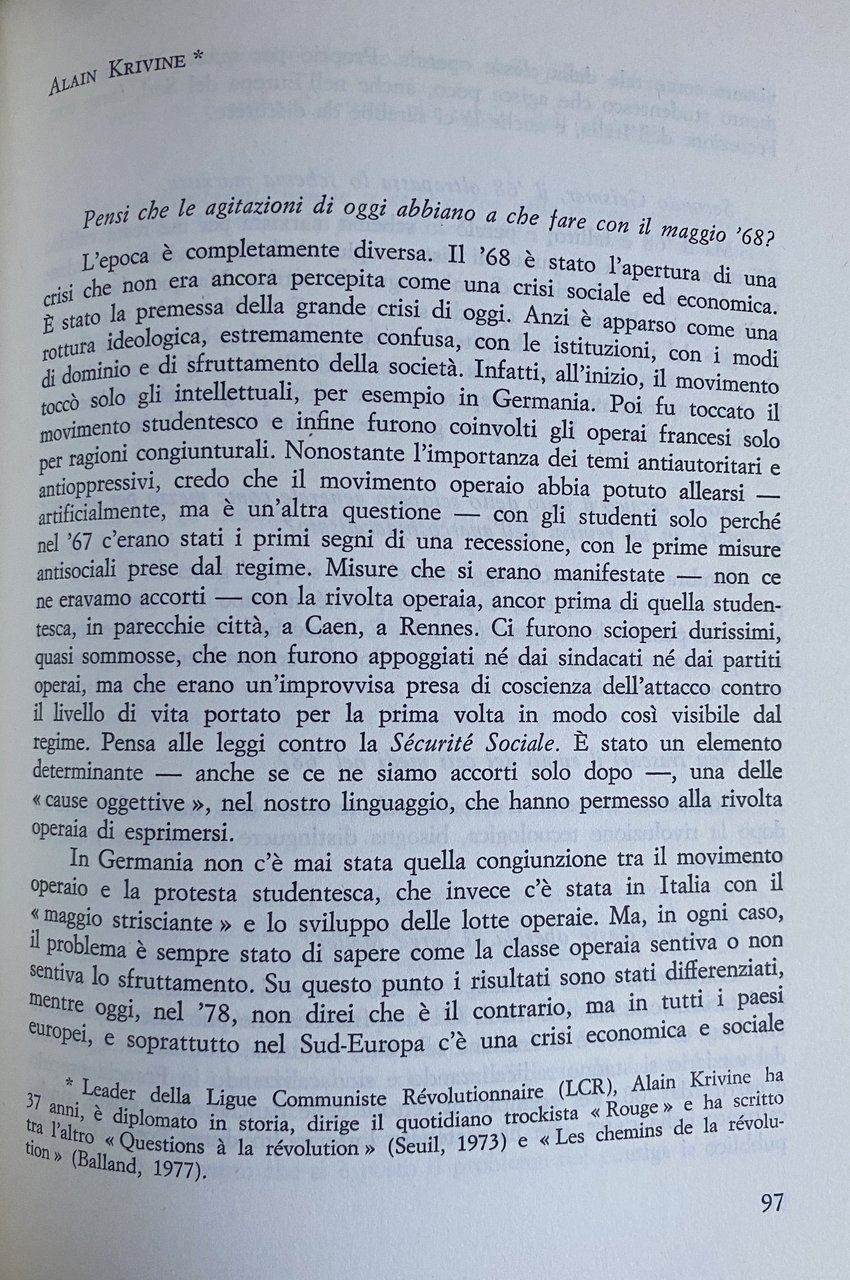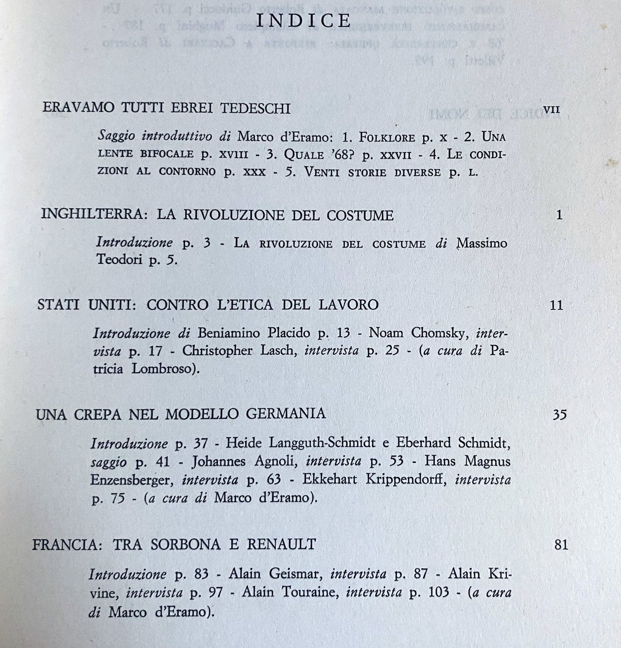 Soggetti: Contestazione Movimento studentesco Rivoluzione Saggi Sinistra Potere Politica Classe operaia Raccolte Antologie Scritti politici Filosofia Marxismo Movimenti studenteschi sociali Sessantotto Emancipazione femminile Parità di genere Uguaglianza Cultura di massa Fascismo Nazismo Ebrei tedeschi Antifascismo Folklore Costume Costumi Abbigliamento Sessualità Regno Unito America Linguaggio Linguistica Interviste Germania Colpa Anni Settanta Terrorismo Avanguardia Lotta armata Fabbriche Operai Lavoro Salario Francia Studenti Studentesca Manifestazioni Ribellione Sorbona Università Renault Scioperi Autunno caldo Brigate Rosse Scuola Fabbrica Patriarcato Edipo Uccisione Padre Femminismo Donne Cambiamento Classi dirigenti Radicalismo Storia contemporanea Società Testimonianze Ideologie politiche Cohn-Bendit Rudi Dutschke Guido Viale New York Review Esprit a Temps Modernes Kursbuch Piombo Opinioni Dibattito Stampa Mass-media Gauchisme Communisme Comunismo LEFÈVRE RABEHL Rebellion der Studenten oder Opposition Rowol Restaurazione Roland Barthes Retorica Roman Jakobson Minigonna Indiani Metropolitani Pop Danze Balli Canti Pierre Bourdieu Lévy-Strauss Marcuse Sarte Simone de Beauvoir Jean Ferrat Cinema Utopia Occupazione Berkeley Althusser Sociologia Durkheim Michel Foucault Sorvegliare e punire Modelli Padri Figli Adenauer Agnelli Agnoli Johannes Allende Amendola Andreotti Arbasino Armstrong Neil Aron Raymond Asor Rosa Baez Joan Bakunin Banfi Baudrillard Beatles Bergmann Berlinguer Bettiza Bloch Ernst Bobbio Bordiga Amadeo Bossuet Brandt Willy Braudel Fernand Brentano Breznev Burke Cagol Margherita Camus Castoriadis Castro Fidel Che Guevara Cienfuegos Croce Benedetto Chruscëv D'Alema Debray Régis De Felice Renzo De Gasperi de Gaulle Deleuze Gilles Duverger Maurice Dylan Bob Zimmermann Robert Eisenhower Engels Fabbro Nando Feltrinelli Giangiacomo Ferrarotti Flores d'Arcais Foa Vittorio Fofi Goffredo Fortini Franco Freud Habermas Jürgen Hegel Hesse Hermann Hobsbawm Eric Hô chỉ min Hölderlin Gadda Galbraith Galli Giorgio Jacometti Gandhi Jung Geismar Alain Kafka Franz Kant Giap Nguiem Vam Ginsberg Allen Kelsen Hans Kennedy Glucksmann André Gramsci Antonio Guattari Félix Harrington Michael Kerouac Jack Keynes Kiesinger King Martin Luther Kleist Krahl Krippendorff Labriola Lacan Jacques Laika Lassalle Leibniz Lenin Liala Lumumba Lukacs György Luperini Lussu Luxemburg Magri Lucio Mahler Malcolm X Mallet Mandel Marshall Martinet Marx Karl Maspéro Mazzolari don Primo Mc Carthy Luhan Meinhof Merleau-Ponty Mitterrand Momigliano Mondolfo Rodolfo Montale Moravia Morin Edgar Mosca Gaetano Musset Mussolini Negri Toni Nietzsche Nixon Nizan Pannella Marco Panzieri Raniero Pareto Vilfredo Parlato Valentino Pasolini Pierpaolo Piperno Pompidou Popper Prévert Proust Marcel Reich Robespierre Roncalli Rossanda Rossana Russel Bertrand Saint-Just Salvatorelli Luigi Salvemini Savinio Alberto Séguy Servan-Schreiber Imperialismo Comunicazione Letteratura Libri rari fuori catalogo Collezionismo Consultazione Sofri Adriano Solmi Solzenicyn Trockij Springer Stalin Svevo Italo Vianson-Pontè Weber Max Weiss Peter Tito Togliatti Torres Camillo Zolo Danilo Slogan Liberazione sessuale Blues Brothers Collettivo Diritto Studio Discriminazioni Diritti Rivolta Autogestione Violenza Protest Students movement Revolution Essays Left Power Politics Working class Collections Anthologies Political writings Philosophy Marxism Social movements Sixty-eight Women Emancipation Gender Equality Mass culture Fascism Nazism German Jews Anti-fascism Costumes Clothing Sexuality United Kingdom Language Linguistics Interviews Germany Guilt Seventies Terrorism Avant-garde Armed struggle Factories Workers Work Wages France Demonstrations Sorbonne University Strikes Hot Autumn Red Brigades School Factory Patriarchy Oedipus Killing Father Feminism Change Ruling classes Radicalism Contemporary history Society Testimonies Ideologies Lead Opinions Debate Press Communism Restoration Rhetoric Metropolitan Indians Dances Balls Songs Occupation Sociology Discipline and punish Models Fathers Sons Imperialism Communication Literature Rare books out of print Collectibles Consultation Sexual liberation Collective Law Study Discrimination Rights Revolt Self-management Violence Miniskirt Maggio francese French May Vietnam Antiautoritarismo Autorità paterna