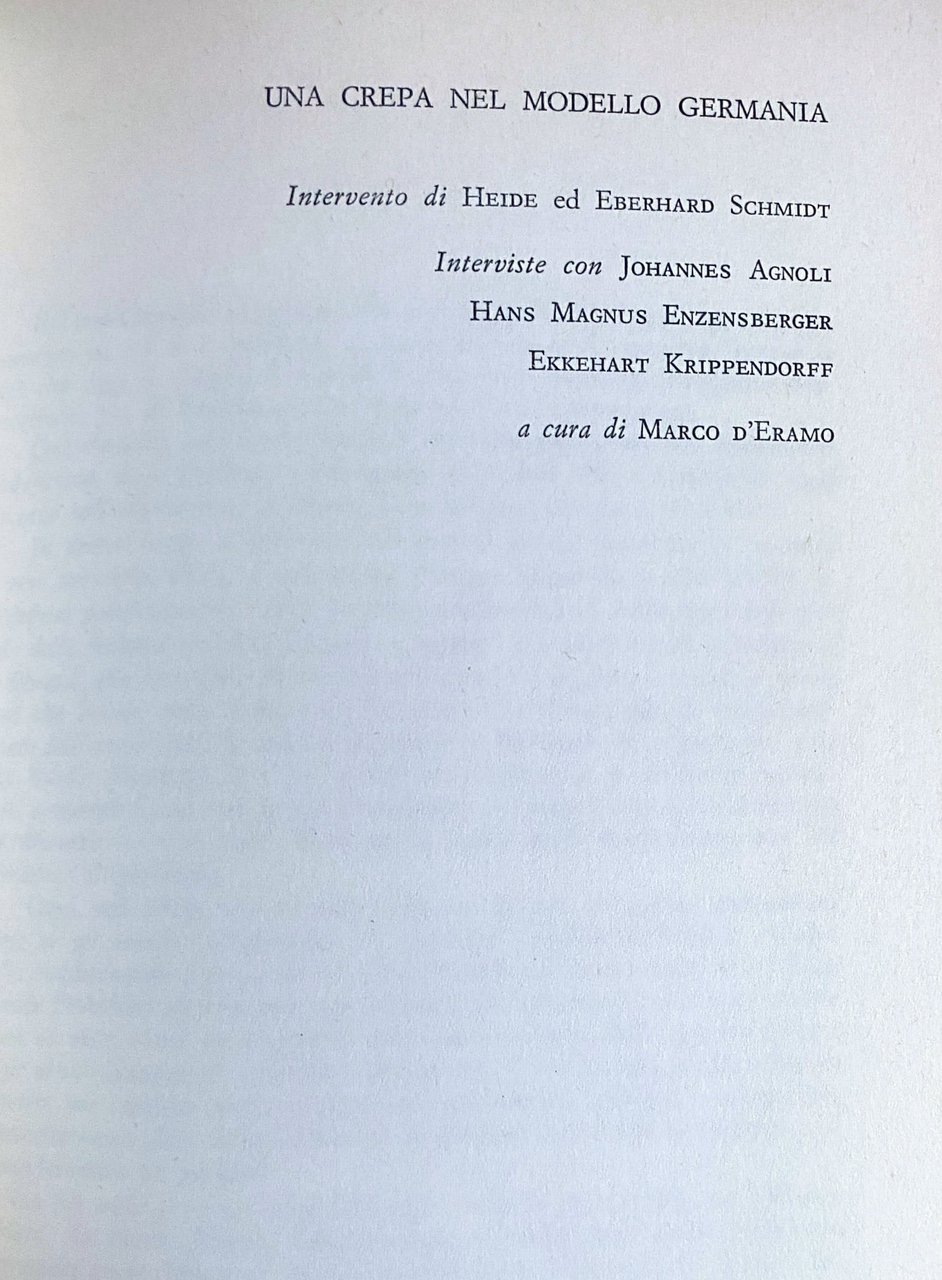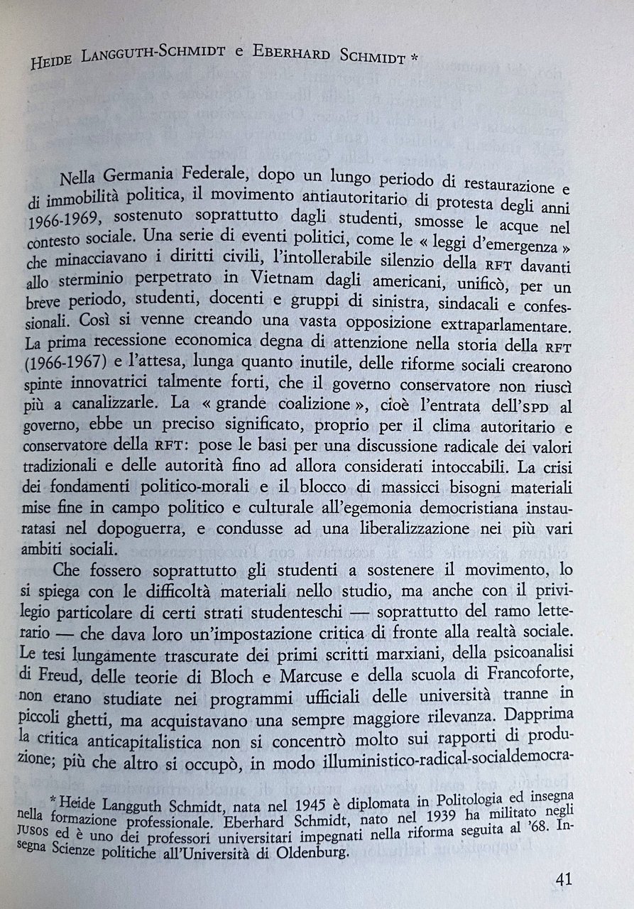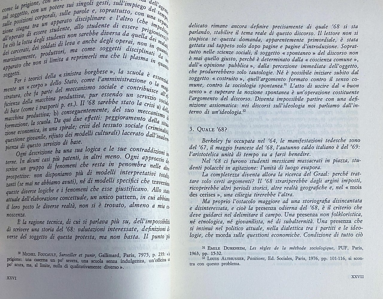 Soggetti: Contestazione Movimento studentesco Rivoluzione Saggi Sinistra Potere Politica Classe operaia Raccolte Antologie Scritti politici Filosofia Marxismo Movimenti studenteschi sociali Sessantotto Emancipazione femminile Parità di genere Uguaglianza Cultura di massa Fascismo Nazismo Ebrei tedeschi Antifascismo Folklore Costume Costumi Abbigliamento Sessualità Regno Unito America Linguaggio Linguistica Interviste Germania Colpa Anni Settanta Terrorismo Avanguardia Lotta armata Fabbriche Operai Lavoro Salario Francia Studenti Studentesca Manifestazioni Ribellione Sorbona Università Renault Scioperi Autunno caldo Brigate Rosse Scuola Fabbrica Patriarcato Edipo Uccisione Padre Femminismo Donne Cambiamento Classi dirigenti Radicalismo Storia contemporanea Società Testimonianze Ideologie politiche Cohn-Bendit Rudi Dutschke Guido Viale New York Review Esprit a Temps Modernes Kursbuch Piombo Opinioni Dibattito Stampa Mass-media Gauchisme Communisme Comunismo LEFÈVRE RABEHL Rebellion der Studenten oder Opposition Rowol Restaurazione Roland Barthes Retorica Roman Jakobson Minigonna Indiani Metropolitani Pop Danze Balli Canti Pierre Bourdieu Lévy-Strauss Marcuse Sarte Simone de Beauvoir Jean Ferrat Cinema Utopia Occupazione Berkeley Althusser Sociologia Durkheim Michel Foucault Sorvegliare e punire Modelli Padri Figli Adenauer Agnelli Agnoli Johannes Allende Amendola Andreotti Arbasino Armstrong Neil Aron Raymond Asor Rosa Baez Joan Bakunin Banfi Baudrillard Beatles Bergmann Berlinguer Bettiza Bloch Ernst Bobbio Bordiga Amadeo Bossuet Brandt Willy Braudel Fernand Brentano Breznev Burke Cagol Margherita Camus Castoriadis Castro Fidel Che Guevara Cienfuegos Croce Benedetto Chruscëv D'Alema Debray Régis De Felice Renzo De Gasperi de Gaulle Deleuze Gilles Duverger Maurice Dylan Bob Zimmermann Robert Eisenhower Engels Fabbro Nando Feltrinelli Giangiacomo Ferrarotti Flores d'Arcais Foa Vittorio Fofi Goffredo Fortini Franco Freud Habermas Jürgen Hegel Hesse Hermann Hobsbawm Eric Hô chỉ min Hölderlin Gadda Galbraith Galli Giorgio Jacometti Gandhi Jung Geismar Alain Kafka Franz Kant Giap Nguiem Vam Ginsberg Allen Kelsen Hans Kennedy Glucksmann André Gramsci Antonio Guattari Félix Harrington Michael Kerouac Jack Keynes Kiesinger King Martin Luther Kleist Krahl Krippendorff Labriola Lacan Jacques Laika Lassalle Leibniz Lenin Liala Lumumba Lukacs György Luperini Lussu Luxemburg Magri Lucio Mahler Malcolm X Mallet Mandel Marshall Martinet Marx Karl Maspéro Mazzolari don Primo Mc Carthy Luhan Meinhof Merleau-Ponty Mitterrand Momigliano Mondolfo Rodolfo Montale Moravia Morin Edgar Mosca Gaetano Musset Mussolini Negri Toni Nietzsche Nixon Nizan Pannella Marco Panzieri Raniero Pareto Vilfredo Parlato Valentino Pasolini Pierpaolo Piperno Pompidou Popper Prévert Proust Marcel Reich Robespierre Roncalli Rossanda Rossana Russel Bertrand Saint-Just Salvatorelli Luigi Salvemini Savinio Alberto Séguy Servan-Schreiber Imperialismo Comunicazione Letteratura Libri rari fuori catalogo Collezionismo Consultazione Sofri Adriano Solmi Solzenicyn Trockij Springer Stalin Svevo Italo Vianson-Pontè Weber Max Weiss Peter Tito Togliatti Torres Camillo Zolo Danilo Slogan Liberazione sessuale Blues Brothers Collettivo Diritto Studio Discriminazioni Diritti Rivolta Autogestione Violenza Protest Students movement Revolution Essays Left Power Politics Working class Collections Anthologies Political writings Philosophy Marxism Social movements Sixty-eight Women Emancipation Gender Equality Mass culture Fascism Nazism German Jews Anti-fascism Costumes Clothing Sexuality United Kingdom Language Linguistics Interviews Germany Guilt Seventies Terrorism Avant-garde Armed struggle Factories Workers Work Wages France Demonstrations Sorbonne University Strikes Hot Autumn Red Brigades School Factory Patriarchy Oedipus Killing Father Feminism Change Ruling classes Radicalism Contemporary history Society Testimonies Ideologies Lead Opinions Debate Press Communism Restoration Rhetoric Metropolitan Indians Dances Balls Songs Occupation Sociology Discipline and punish Models Fathers Sons Imperialism Communication Literature Rare books out of print Collectibles Consultation Sexual liberation Collective Law Study Discrimination Rights Revolt Self-management Violence Miniskirt Maggio francese French May Vietnam Antiautoritarismo Autorità paterna