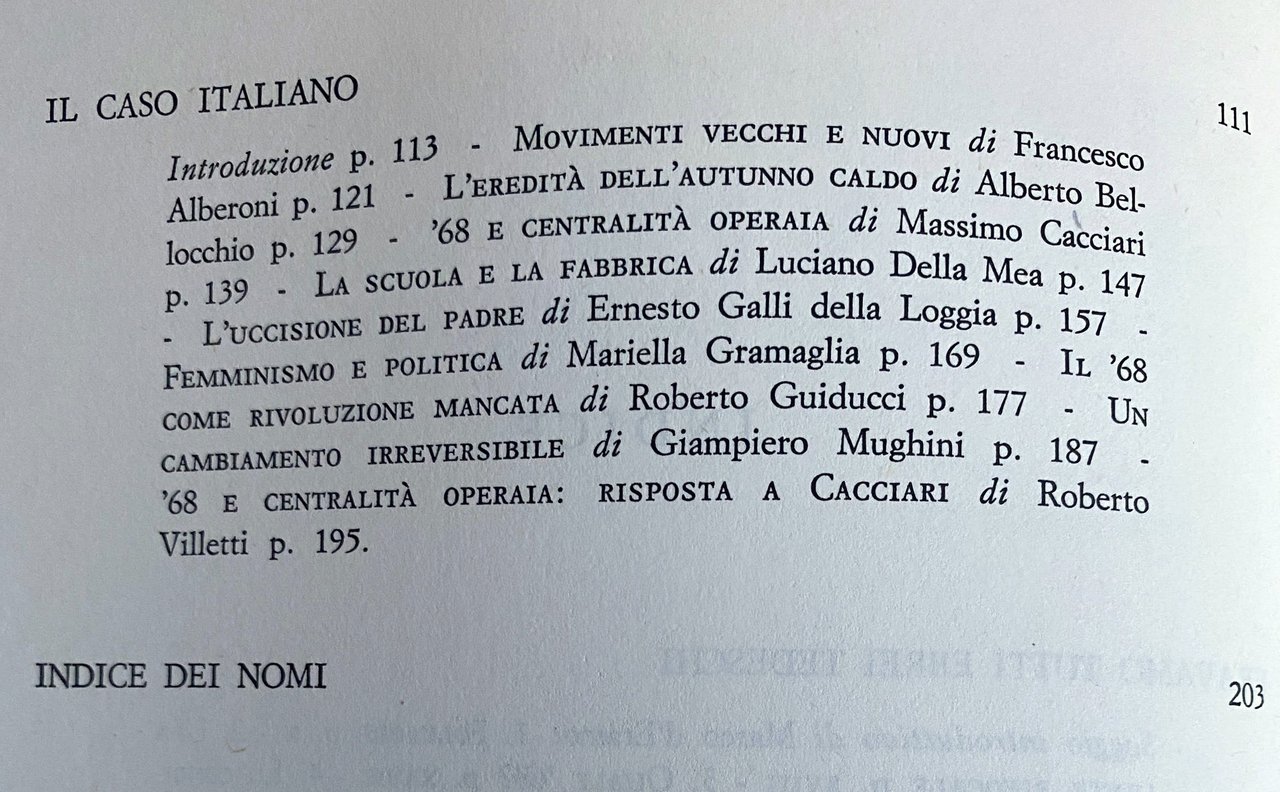 - Marco D'Eramo, Massimo Teodori, Beniamino Placido, Noam Chomsky, Christopher Lasch, Patricia Lombroso, Heide Langguth-Schmidt, Eberhard Schmidt, Johannes Agnoli, Hans Magnus Enzensberger, Ekkehart Krippendorff, Alain Geismar, Alain Krivine, Alain Touraine, Francesco Alberoni, Alberto Bellocchio, Massimo Cacciari, Luciano Della Mea, Ernesto Galli della Loggia, Mariella Gramaglia, Roberto Guiducci, Giampiero Mughini, Roberto Villetti