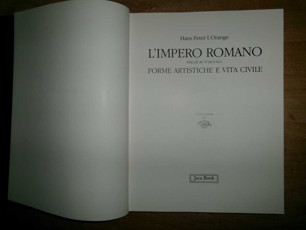 HANS PETER L' ORANGE. Milano, Edizione speciale per Jaca Book, 1988. L' Impero Romano dal III al VI secolo. Forme artistiche e vita civile. In-4°, tela edit. bleu con sovracopertina ill. a col. 233 pp. con numerose ill. a col. e in bianco e nero anche a piena pagina. Come nuovo. Uff. C - III - 3 - 2