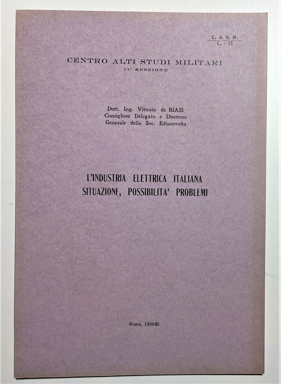 Centro di Alti Studi Militari: 11^ Sessione - V. De Blasi - L'Industria Elettrica Italiana: Situazione, Possibilità problemi 1959-60 Testo in lingua italiana. Pagine 23 Copertina morbida. Condizioni molto buone. Â