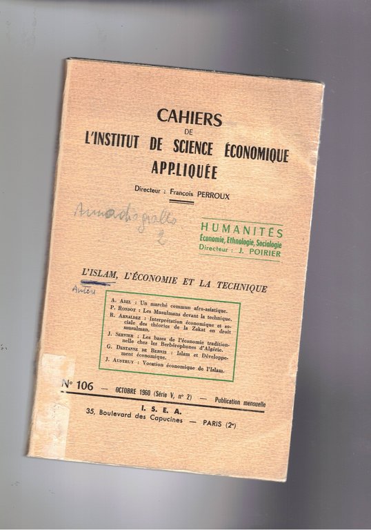 L'Islam , l'économie et la technique. n° 106 del periodico mensile Cahiers de l'Institut de Science Economique Appliques.