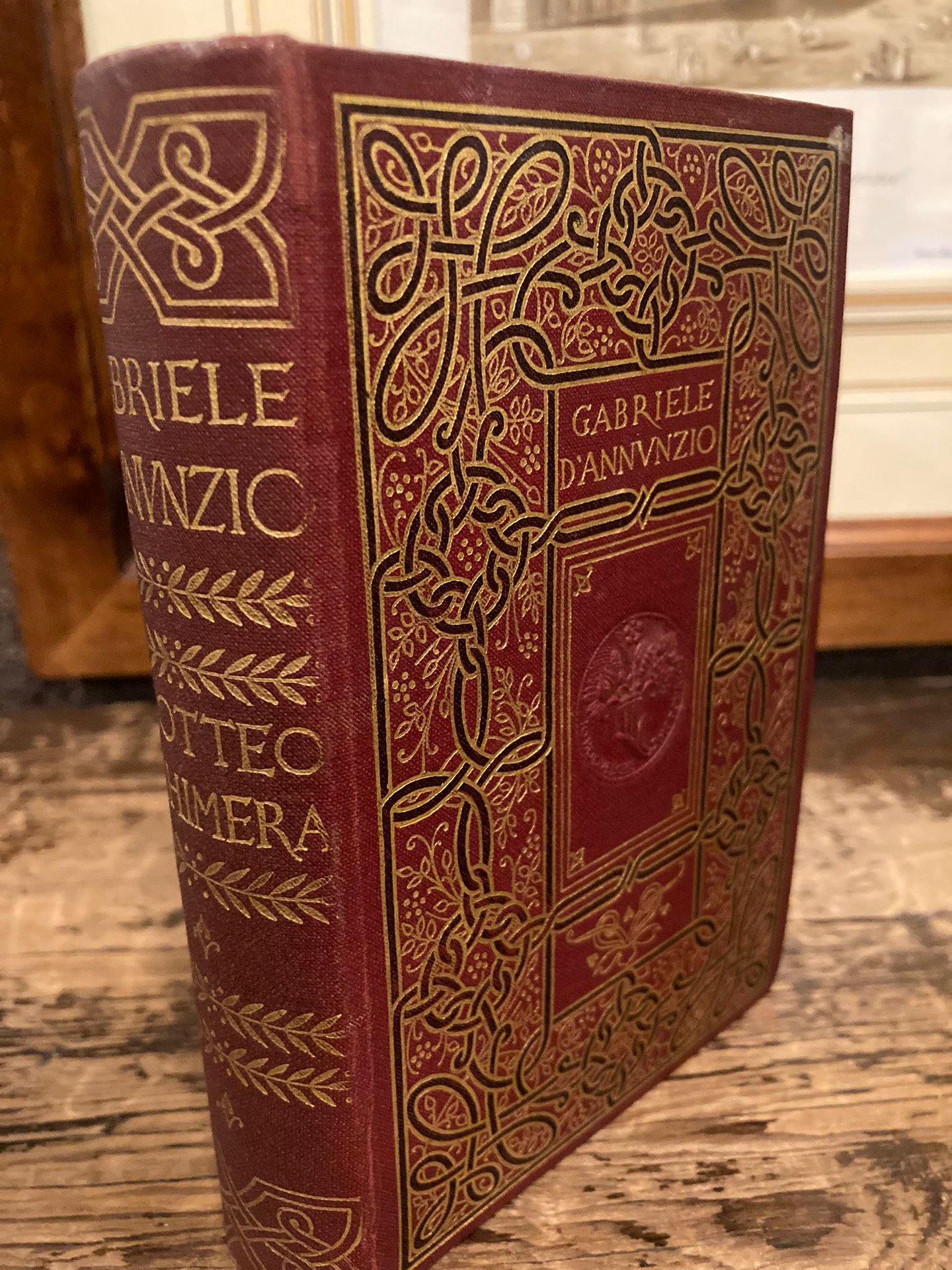 In-16° (15x10 cm), pp. (4), 338 (2), tela cremisi editoriale con titoli dorati al dorso e al piatto anteriore con motto 'Io ho quel che ho donato' entro elaborata cornice a motivi fitomorfi intrecciati, sguardie decorate. Ottimo esemplare. Ristampa nella variante con copertina in tela lavorata di due delle più importanti raccolte poetiche del Vate. Nella prima raccolta dedicata alla Musa Isaotta Guttadauro tutto è trasfigurato, cesellato come nelle opere di Dante Gabriel Rossetti cui l' autore si ispira ma non ancora stucchevole e manieristico.