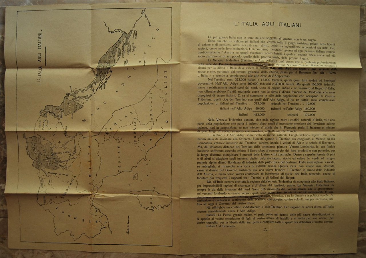 Tipografia Boaro, 1914. Cm. 35x25, volantino di 4 pagine. Alla quarta pagina vi è una cartina delle terre irredente. In ottimo stato.